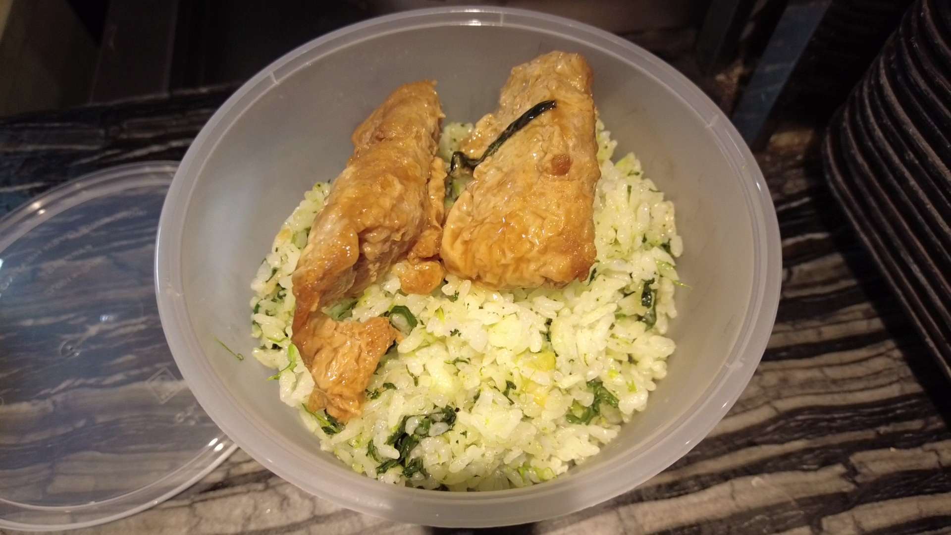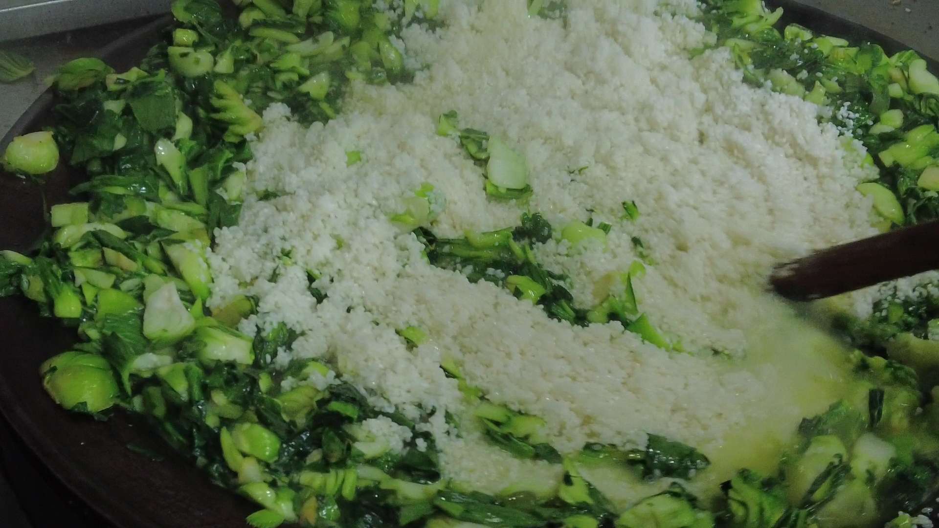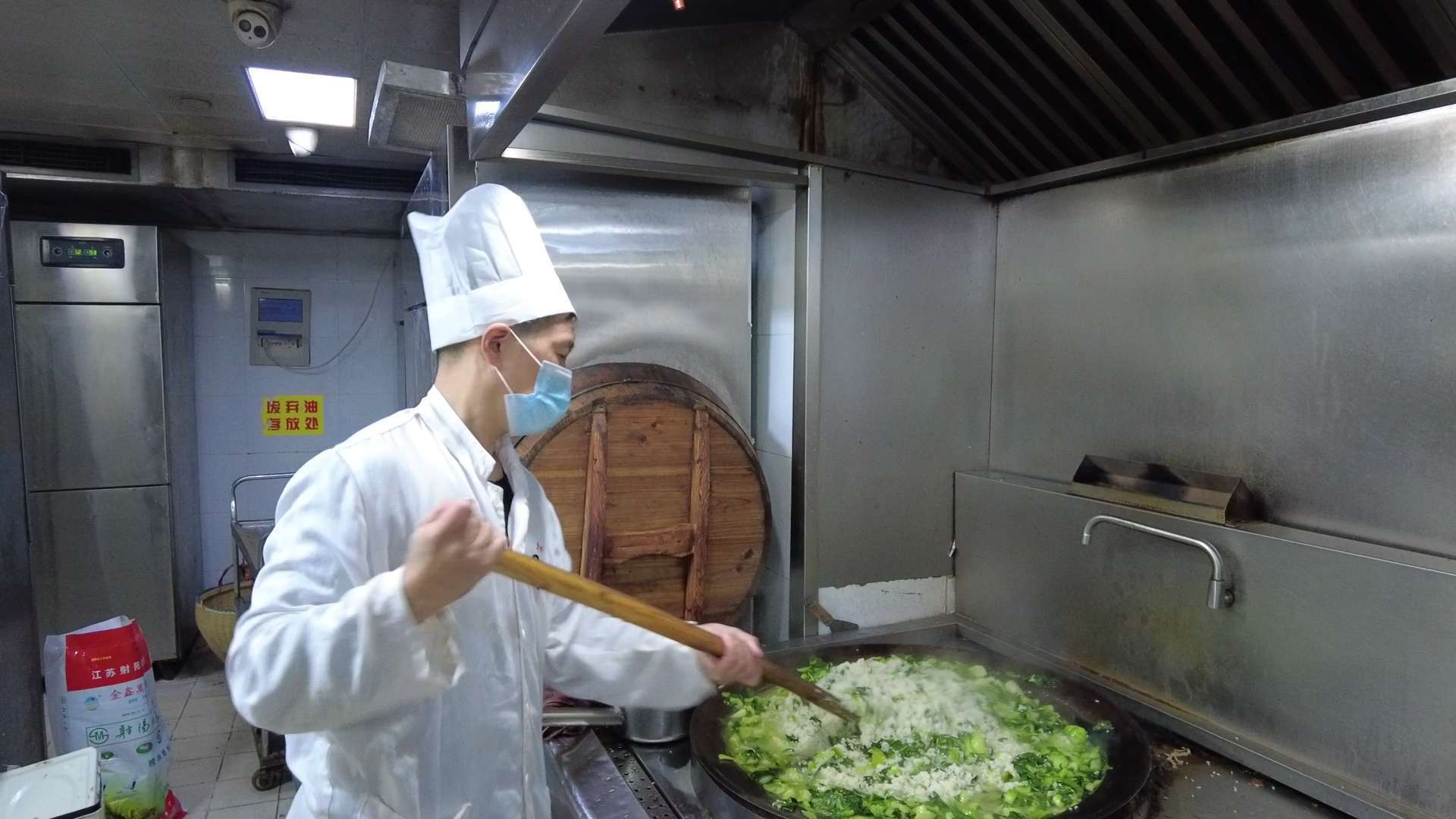 菜饭、黄豆汤都是当天烧制的。只见厨师一边将洗干净的青菜煮在一个大锅内,一边用开水浇一浇大米,让大米涨一涨,再慢慢将大米倒入大锅中与青菜搅拌,然后盖上大木盖,小火焖约15到18分钟,到时打开就是一股香气扑面而来。
