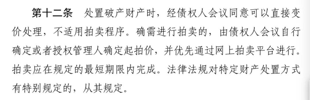 《若干规定》第十二条明确,处置破产财产时,经债权人会议同意可以直接变价处理,不适用拍卖程序。这意味着,对于部分“特殊”的破产财产,有了更高效、快速的处置选择,直接变价有法可依!