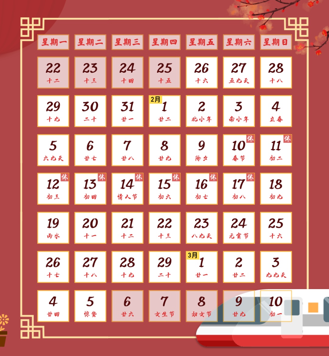 本次春运分为三个阶段:春运前期是从1月26日至2月9日(除夕) 共15天;春节假期是2月10日至2月17日共8天;春运后期是从2月18日至3月5日共17天。详见道路交通出行指南↓
