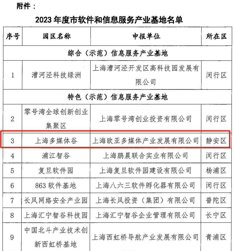 年度市软件和信息服务产业基地名单”。名单显示,位于静安区的上海多媒体谷被评为特色(示范)信息服务产业基地。