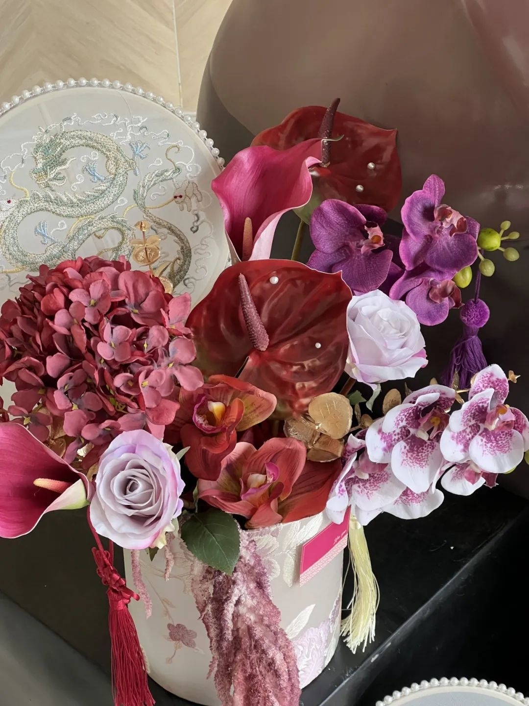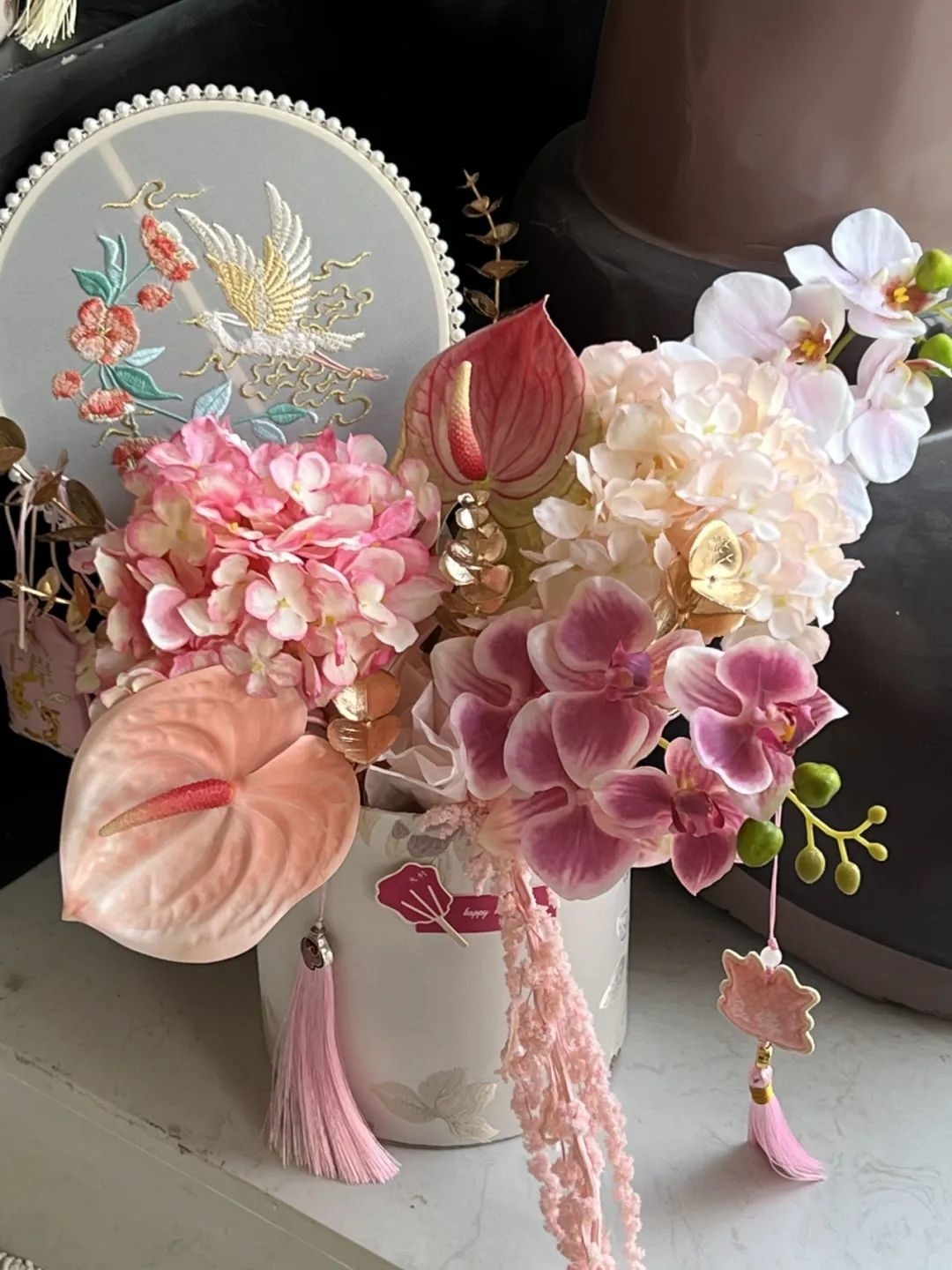 而海汇街一家售卖仿真花的店铺生意也十分红火,价格200多的仿真花福桶颇受年轻顾客喜爱,店内的仿真年宵花福桶以粉红的蝴蝶兰、绣球花为主插花,暖意洋洋,福桶内的各类小配饰也充满新年的美好祝福。