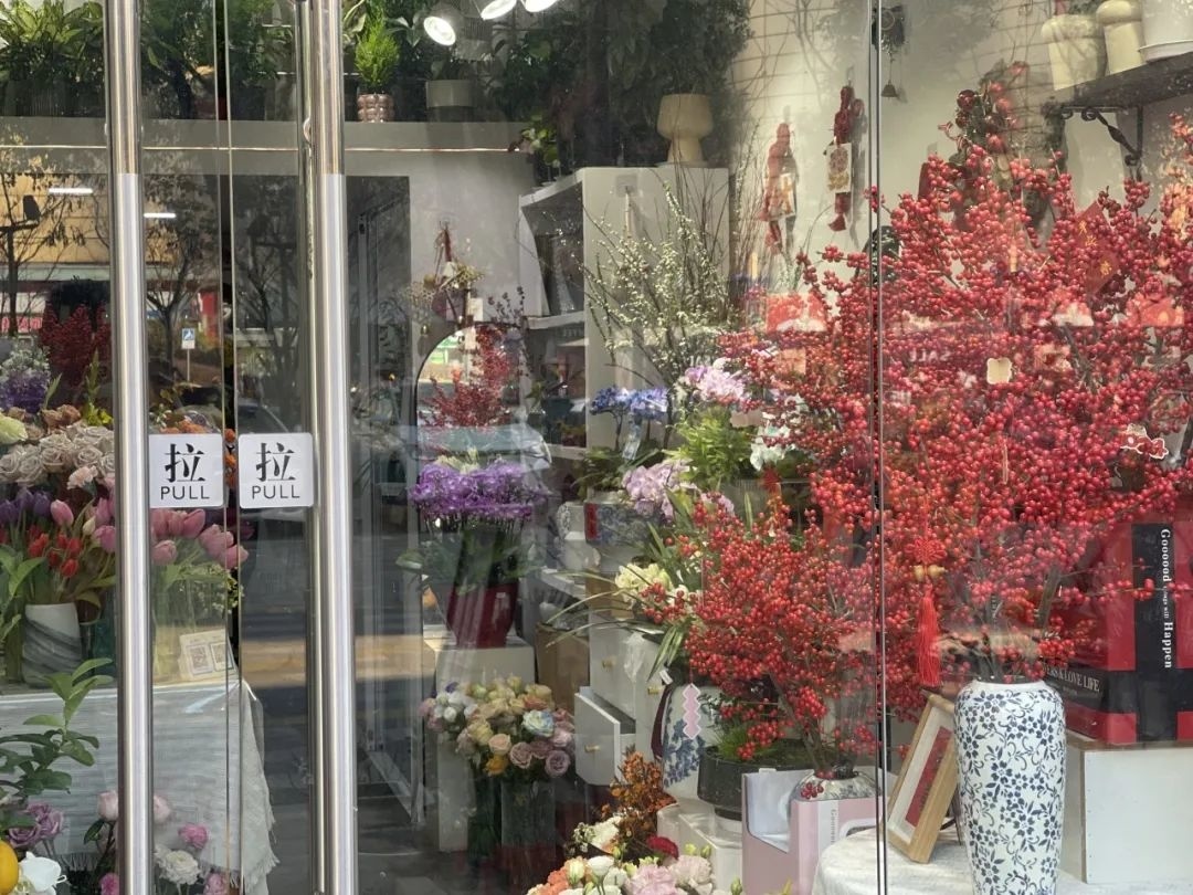 在位于朱泾人民路上的一家花店内,象征着富贵、吉祥的年宵花被店主摆在显眼位置。