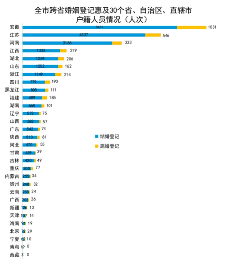 2023年,全市共办理跨省婚姻登记15080对。其中,跨省结婚登记13077对;跨省离婚登记2003对。全市跨省婚姻登记惠及30个省、自治区、直辖市户籍的30160名当事人。