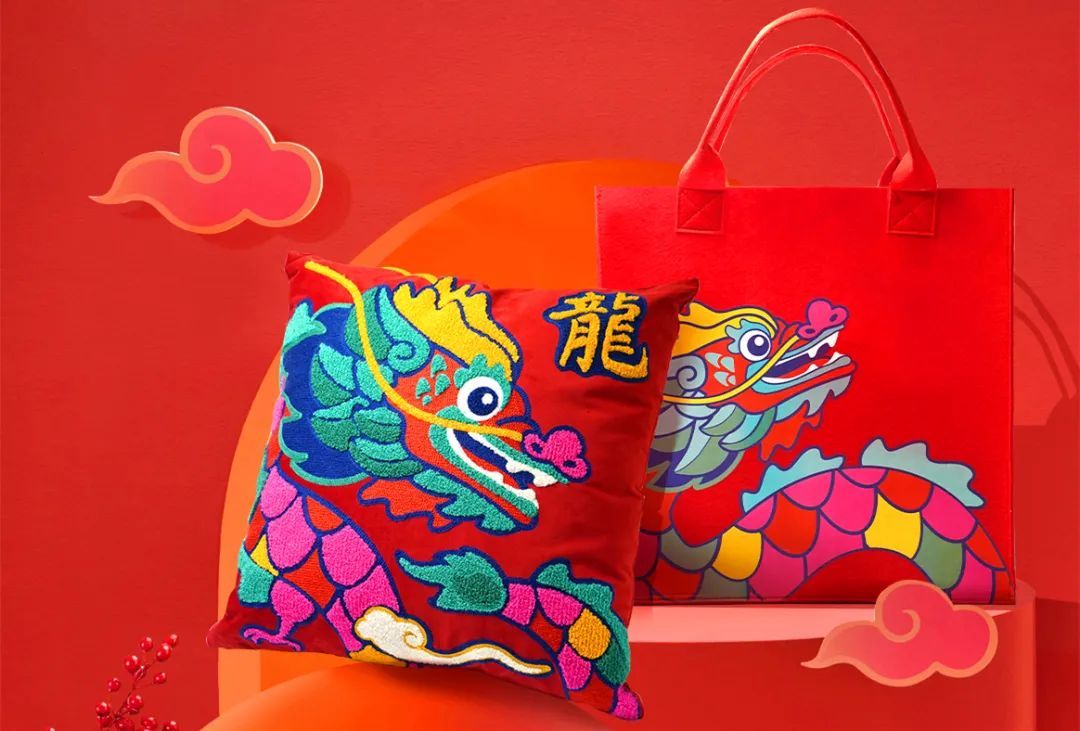 “这次的龙年新品香囊以90后设计师团队为创作核心,注重在传统龙文化与都市时尚感之间找到契合点。比如,这款祥龙香囊靠垫就突破传统绣艺,融合使用立体毛织工艺,还选用流行的毛毡材质进行外包装设计,让国风潮一点,再潮一点。”