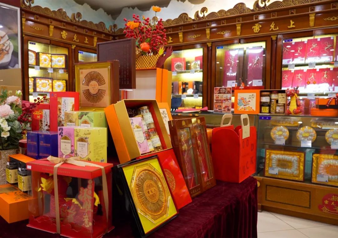 位于静安寺商圈的雷允上药城也换上了吉祥喜庆的新装扮:华山路沿街,在祥云间腾跃的两条金龙向市民传递“金龙纳福,龙腾祥瑞”的美好祝福;店铺里,多款健康年礼礼盒、国潮文创新品齐齐登场,给春节“买买买”再添新去处。