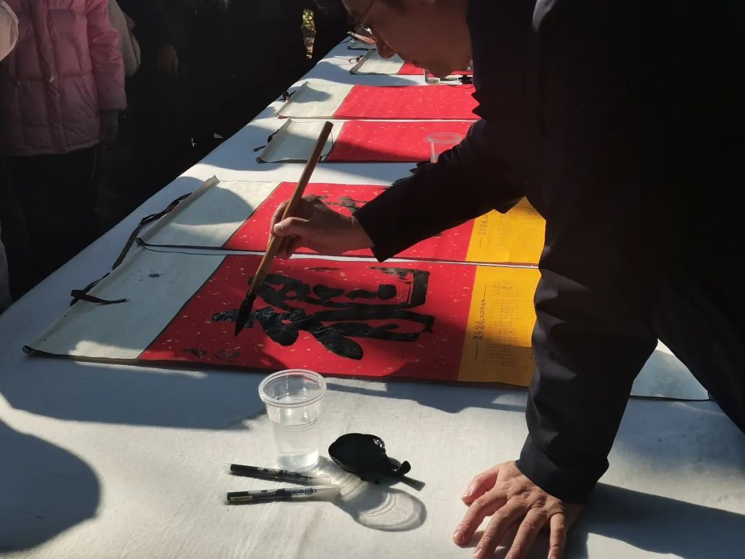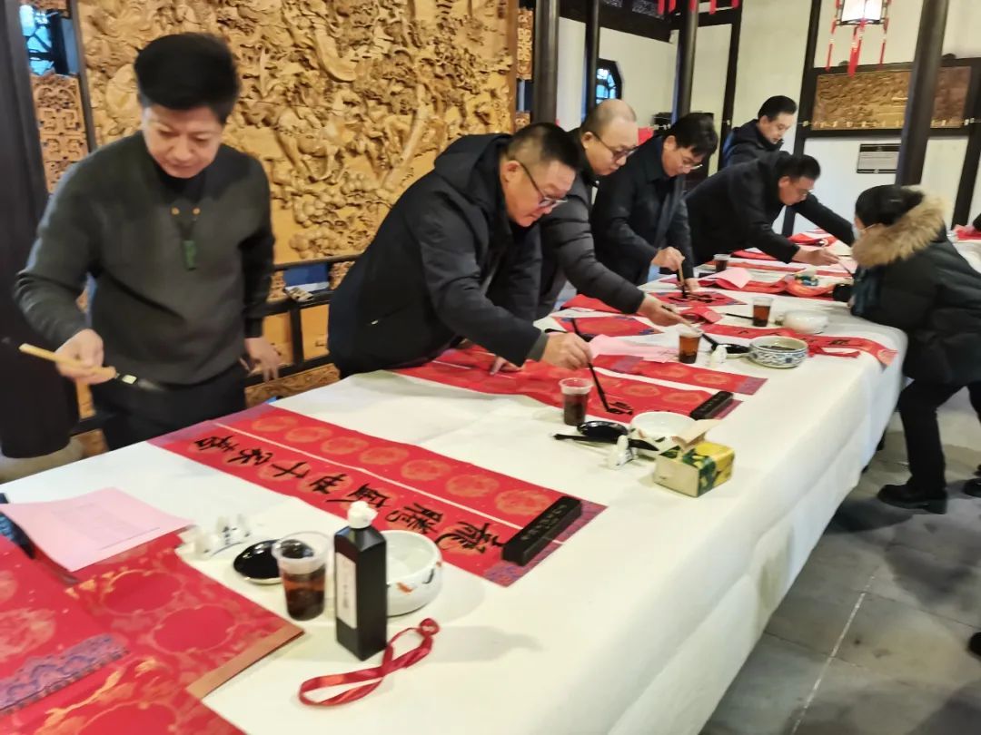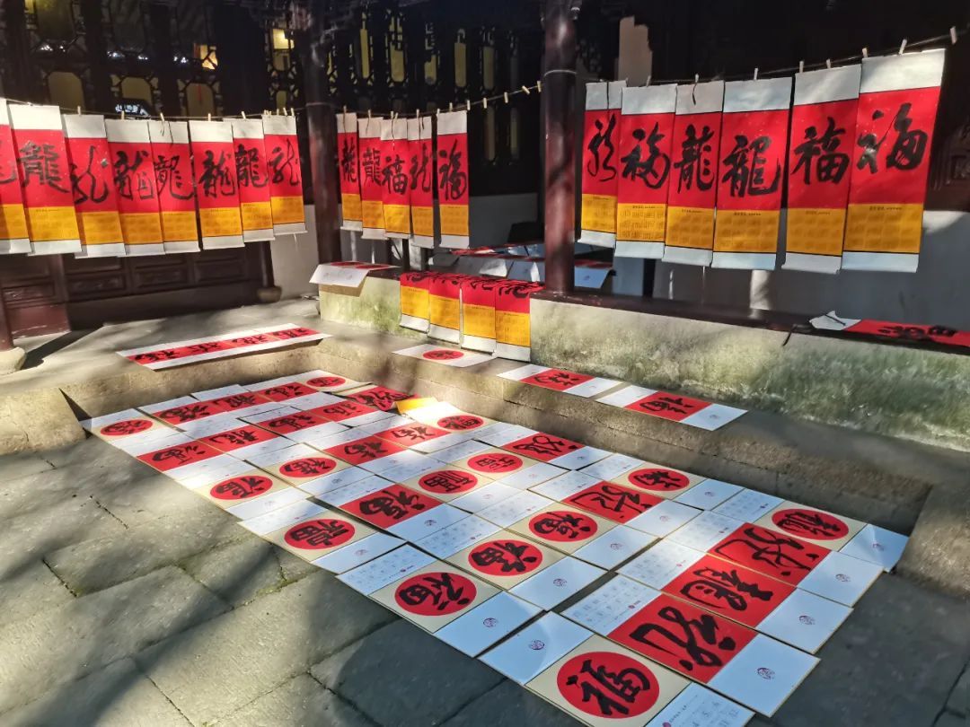 雕花厅外,一副副悬挂的春联随风飘动,散发着淡淡的笔墨书香。室内,书法家们正挥毫泼墨,书写即将赠送给市民游客的500副春联和挂历“福”。作为此次大会的承办方之一,松江区书法家协会主席团成员也在活动中开笔题“龙”,送上了10幅挂历“龙”。