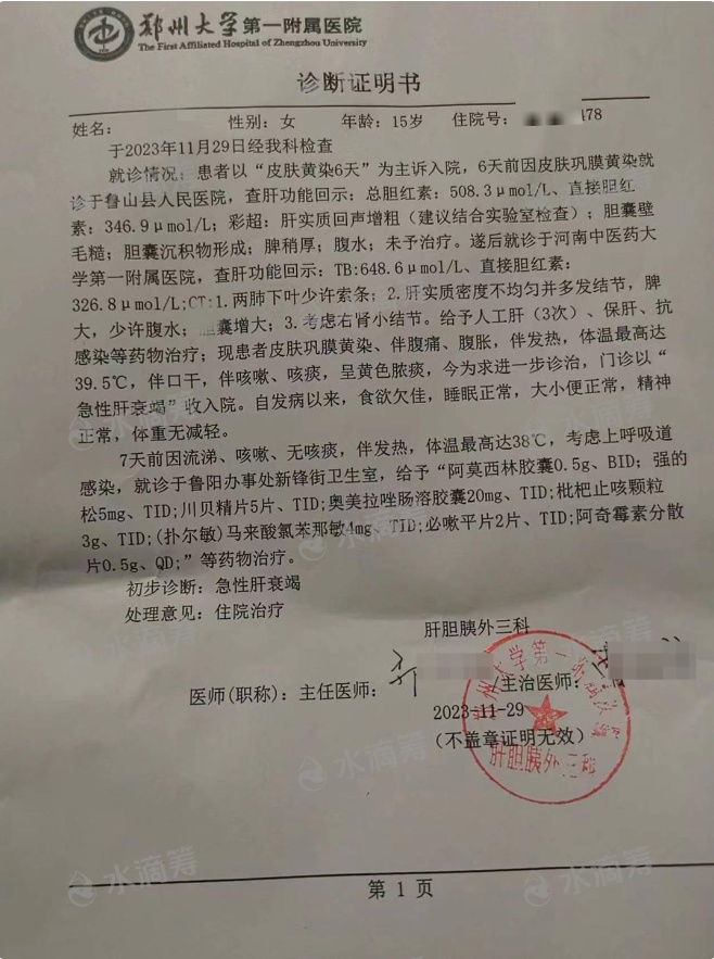 后来,爷爷带着小哲去医院诊治,辗转两家医院后,小哲转入郑州大学第一附属医院,被诊断为“急性肝衰竭”。“真的没有想到,就是吃了普通的感冒药,怎么就要到肝衰竭的程度了。”小哲的爷爷心里发慌。