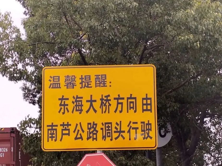 今年1月开展的站前导流二期优化工程中,施工人员在临港服务区南侧绿化带岛头、出口和南路公路收费出口三处点位各增设一块提示“东海大桥方向由南芦公路调头行驶”的标志牌,并于南芦公路出口中分带处,利用现有门架立柱增设了调头指路标志。