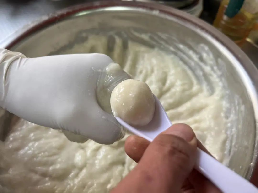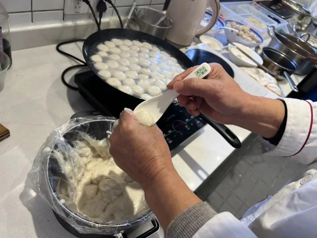 之后,左手攥鱼泥,从虎口处挤出,右手用羹匙接住,放入冷水锅中。忙碌了大半天,一条条活鱼变成一颗颗光滑圆润、色泽洁白的鱼圆。春节前,周亮华一家人一天最多要做100斤鱼圆。