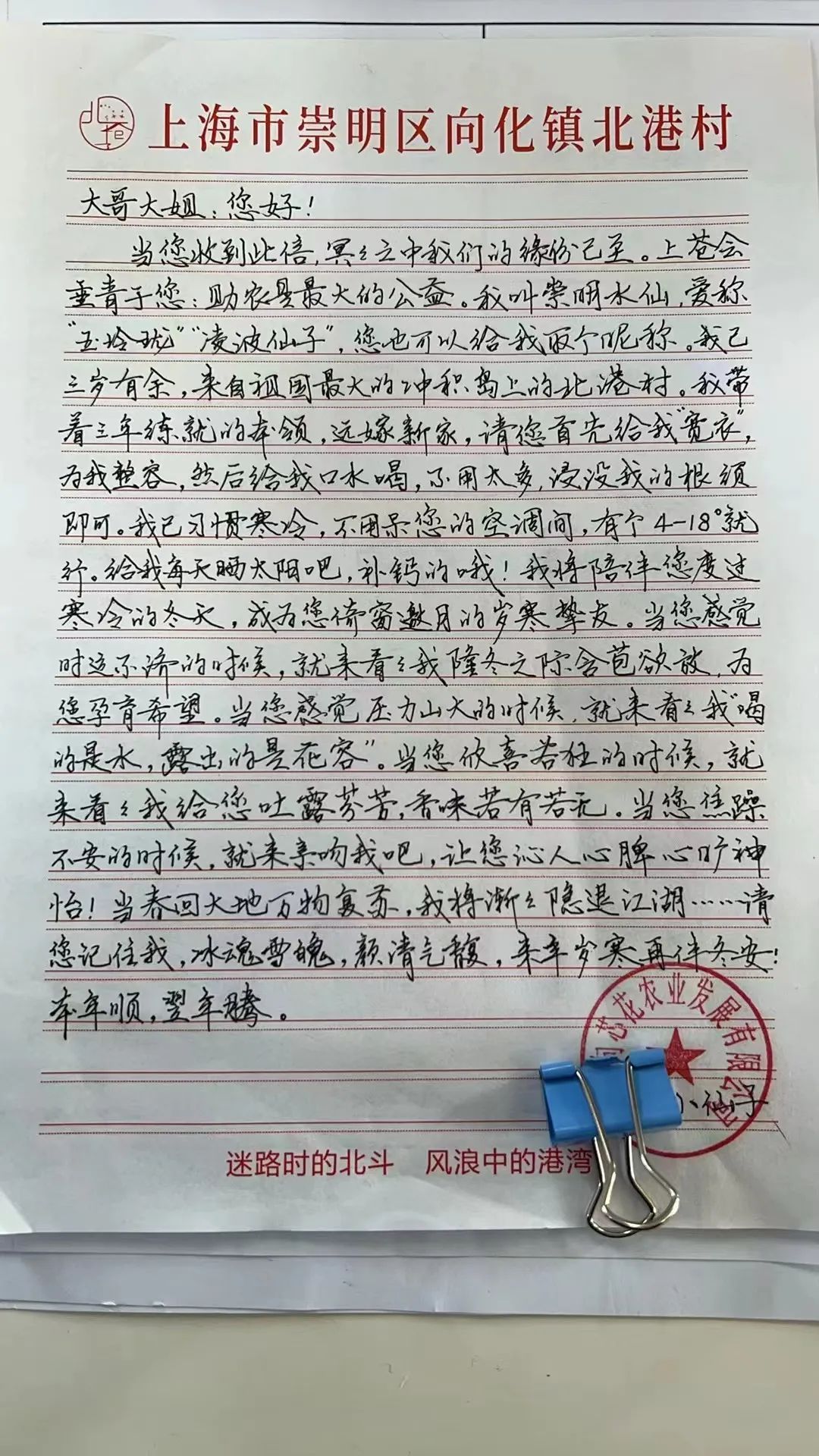 “我也想买,你倒是上链接啊”“花怎么卖,老乡”“哪里有卖,到哪里提货?”……这些留言都来自一位名为“江边半农”的抖音助农博主的评论区,而这位娓娓道来、衣着朴素的博主就是向化镇北港村党总支书记——施庆前。 直播中的施庆前 30天售出5000盆 北港村的水仙又“火”了 “早上7点开始打包,抽空还要拍短视频做宣传,每天卖出300盆左右,江浙沪皖包邮,最远发到新疆……”施庆前说,从2023年12月15日起,他们就开始了水仙盆花线上、线下的售卖,也是从那天起,北港村村委全班人马和参与的农户们一起,开启了一场“水仙售卖突击战”。 春节前夕是年宵花售卖的黄金时段,为了抓牢这个时段,北港村真的是“扑命”了。经过3年的精心培育,今年北港村18亩水仙“商品球”(开花率达到95%以上的水仙花种球)长势喜人,丰产之后如何实现丰收?这可让北港村的村委班子急上心头。为了蹭上短视频直播带货的流量热度,扩大崇明水仙的网络影响力,北港村村委开始了短视频的拍摄及账号运营。 “江边半农”助农账号 “大家好,我是‘江边半农’,我们北港村的复瓣水仙耐寒性强、花期也长……”夹克衫、牛仔裤,不加美颜,一脸淳朴,对于短视频制作推广,施庆前绝对算是刚起步的“小白”,他不懂平台规则也买不起流量加持,但他这个“门外汉”,用真诚打动了受众。 水仙发货现场 线上视频带火了线下销售,企业团购是今年走单量最大的销售模式。为了配合企业大单或早或晚的提货时间,这段时间北港村的村干部们随时待命,时常天没亮就到岗发货,天黑了还在基地里整理。施庆前说,今年村里的水仙这么“火”,卖得这么好,真的“夜来睏笑”,这点累又算得了什么。 “火热”的背后 是三年来的坚持与蛰伏 北港村位于向化镇北端,长久以来以种植水仙而闻名岛内外,村里的“施家花厢”(百叶水仙花合作社)更是目前国内复瓣水仙最大的种植基地。 乘势而上,踏浪而行。为了做好“花文章”,发展“花产业”,2022年,北港村通过“村集体经济组织牵头、社会资本入股、农民自主参与”的运营模式成立了向芯花农业发展有限公司。与此同时,结合本村实际,以“两水一田”的种植模式在277亩农田内,进行水稻与水仙的轮季种植。 为了使水仙成为焕活北港经济的“增收活水”,向化镇在镇级层面制定了农机配套、农田改造、营销物流等政策扶持。“镇上很支持,参与的农户很给力、很期待,我作为党总支书记却感到‘压力山大’……”每一颗水仙花的球茎,都要经历“三种三收”才会迎来一次绽放的机会,所以在这三年里施庆前一直战战兢兢、如履薄冰。 “种的时候怕长不好,长成之后怕卖不好……”应对焦虑最好的方法或许就是做足准备。在今年“商品球”开售前,在前期充分讨论的基础上,定价、包装及销售模式及途径等关键因素及环节都已全部敲定。 订货电话一个接着一个,提货卡车一辆接着一辆,北港“向芯”水仙这三年来的默默蛰伏,也终于在2024年年初迎来了一次盛放。 “击中”消费者的是优质水仙 更是北港温度 “我叫崇明水仙,爱称‘凌波仙子’,您也可以给我取个昵称……”每一个购买北港村“向芯”水仙的消费者,都会在包装盒内收到这样一封信。行文活泼俏皮,不仅科普了水仙的培管要点,更传达了温暖的人文关怀,而这封信的作者就是施庆前。 施庆前的手写信 很多人或许会说,没看出来这个“糙汉子”内里竟然这么文绉绉。其实,这个“江边半农”还真是个半路出家的农民,在做党总支书记前,他曾是有着多年教学经验的小学语文教师。 2020年因工作安排需要,施庆前离开三尺讲台,转战乡间地垄,担任北港村党总支书记一职。如果说教书育人,提高学生的文学素养是做老师时的目标,那么来到北港村如何带领农民增收致富,让老百姓体会到切切实实的获得感和幸福感,是施庆前所面临的挑战、肩负的使命。 水仙发货现场 “今年水仙丰收,让我感到最开心的是让参与的农户们真正挣到钱了,也让观望的老百姓看到了希望。”去年五六户、今年数十户,明年参与的农户一定会更多,施庆前说,水仙就像一把绿色致富的钥匙,而北港村将用这把钥匙不断解锁乡村振兴、农民增收的密码。 在发稿前,记者收到了施庆前发来的信息:顾记者,不要把我写得太好,更不要单写我一个人,我会感到不安,所有的活都是团队一起干的。最后,可以的话请大家一起关注下我们的助农抖音号“江边半农”。