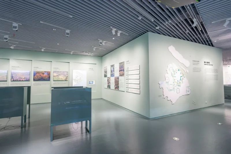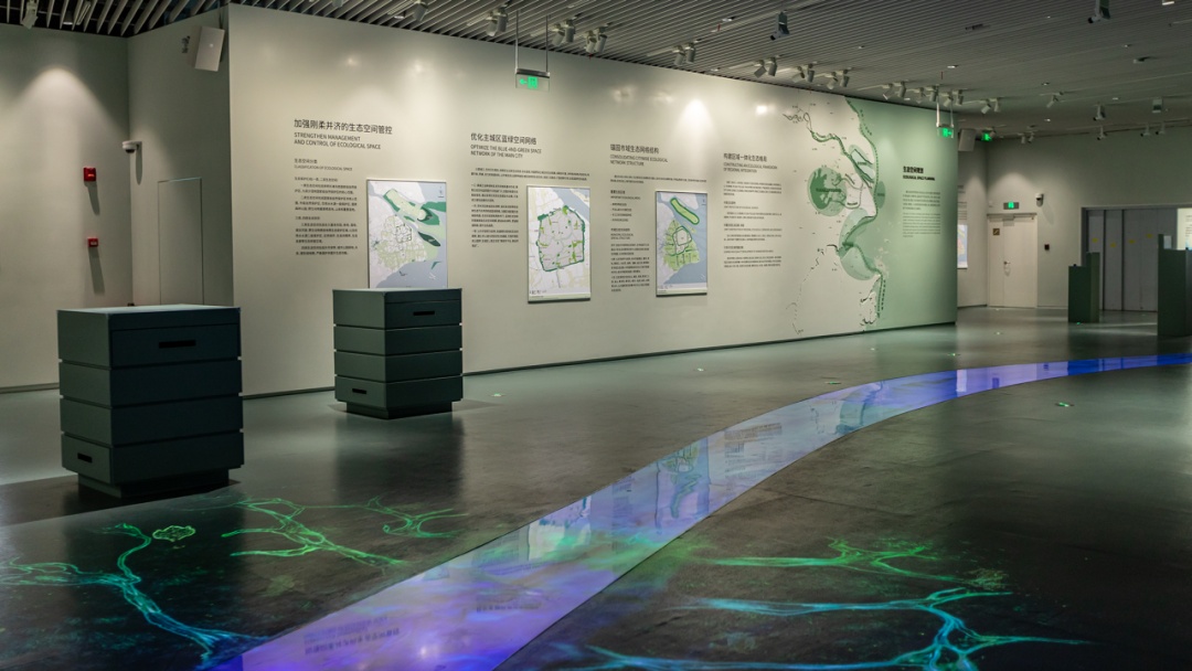 “生态空间规划”展区重点展示“构建区域一体化生态格局”“锚固市域生态网络结构”“优化主城区蓝绿空间网络”“加强刚柔并济的生态空间管控”四个方面的规划内容。全幅面“生态空间规划图”结合凸字形展墙,突出上海生态空间的特色,延续了四层生态规划的脉络。蓝色的地面“河流”与绿色的展台、展墙融合,形成一幅蓝绿交织的美好图景。