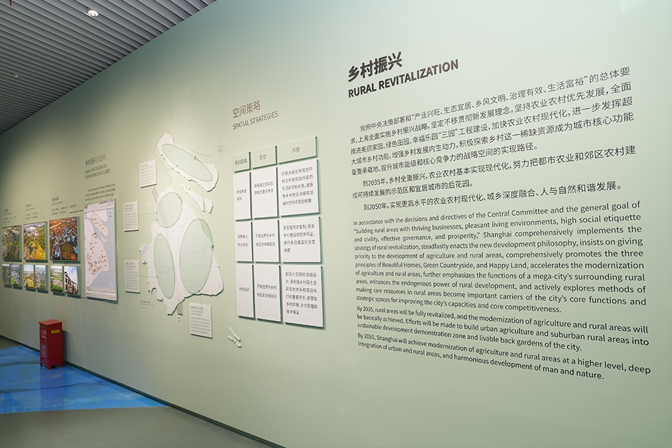 “乡村振兴”展区立足党中央决策部署和乡村振兴总体要求,重点展示了上海乡村振兴空间策略的制度创新,讲述了“冈身松江文化圈”“淞北平江文化圈”“沿海新兴文化圈”和“沙岛文化圈”四个文化圈层的特色,重点围绕风貌传承、产业振兴、生态宜居三种类型,展示上海乡村振兴示范村案例和乡村建设的实践探索。