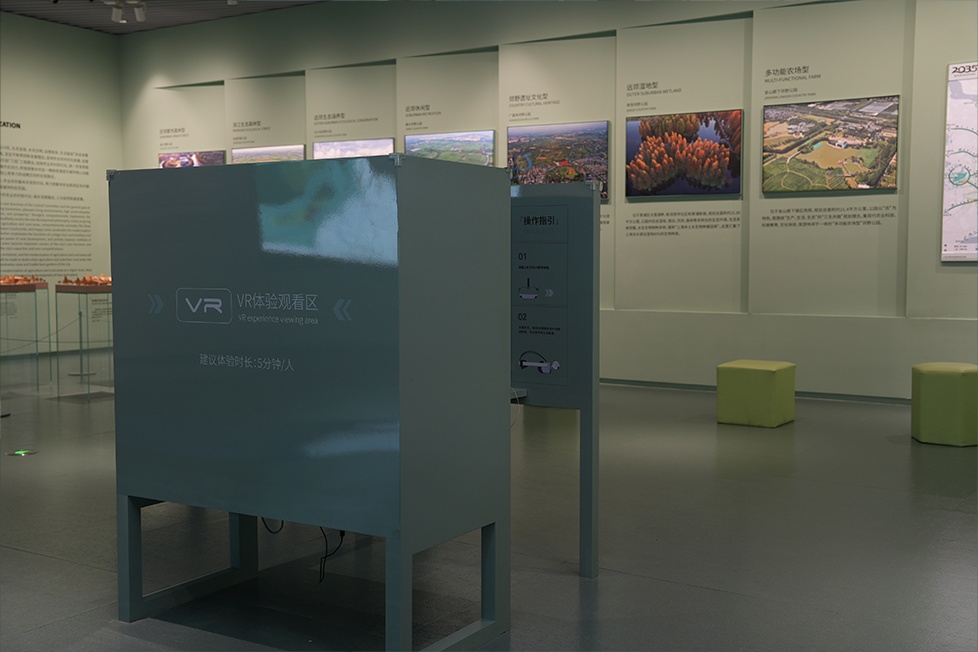 观众戴上VR一体机便可身临其境地感受三维立体技术带来的视觉冲击——春风拂过金山廊下郊野公园的万亩良田和大地景观,夏季青西郊野公园里一片郁郁葱葱,秋季的嘉北郊野公园中油画一般的水乡美景,冬季的广富林郊野公园的文化韵味如同一幅水墨画。