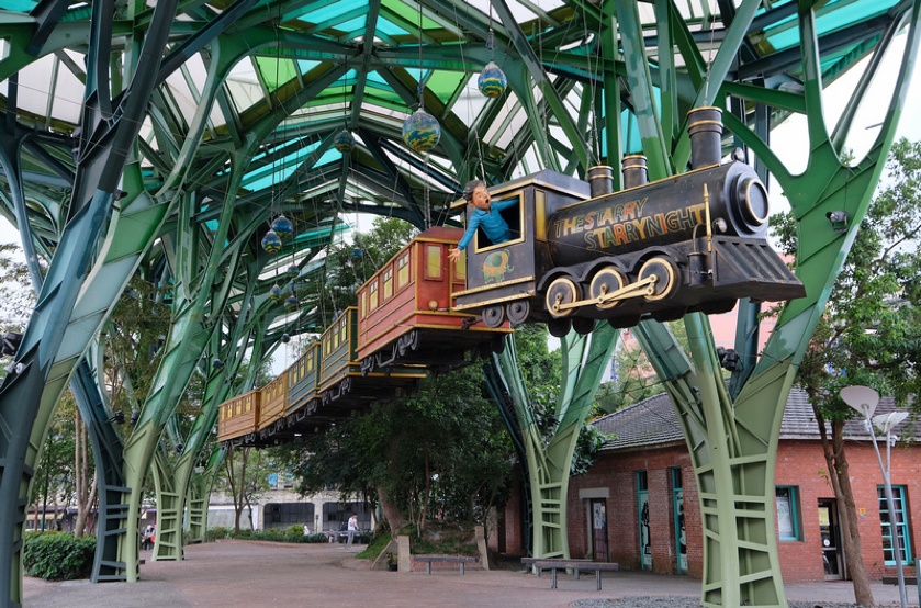宜兰车站最特别之处在于,车站周边规划出“几米主题广场”。包括站前广场对面的“丢丢当森林”,抬头就能看到长30米,重达3000公斤的“几米星空列车”悬吊在空中。