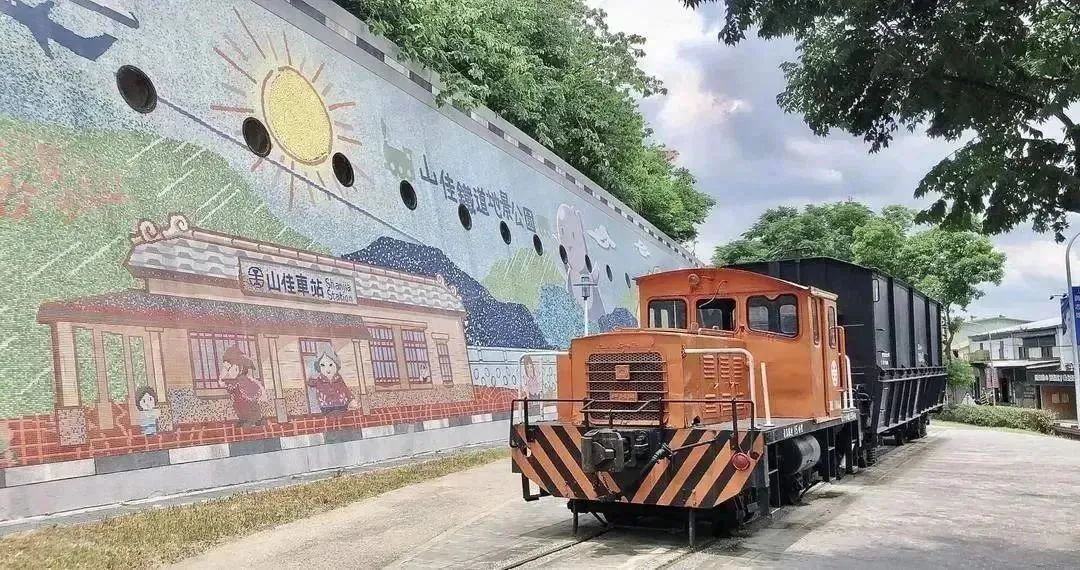 铁道地景公园就在山佳车站旁边,沿着山佳街会发现沿途墙面上有许多时下最夯的3D立体彩绘,如大白鲨、袋鼠、恐龙、台湾黑熊等,个个逗趣又逼真。还有一辆47年历史的黑色煤斗车。
