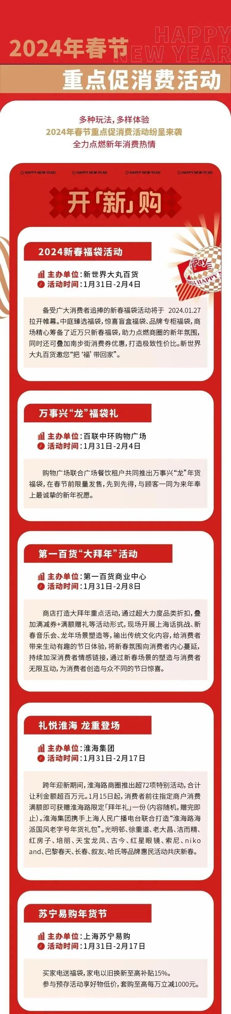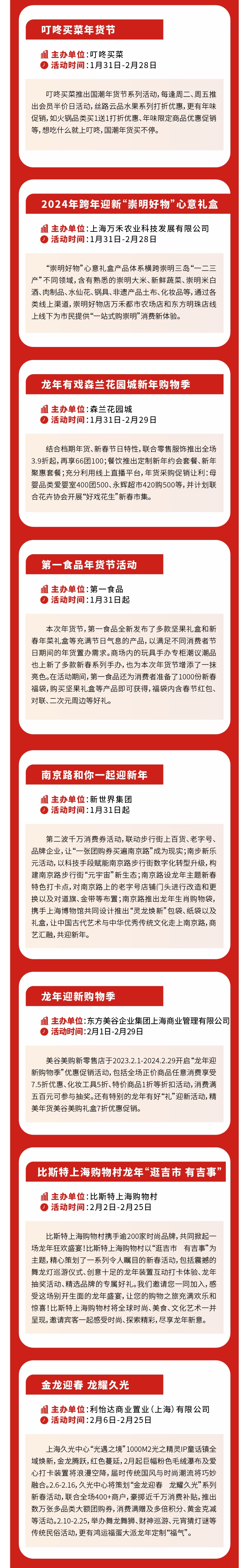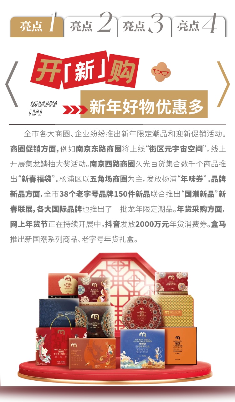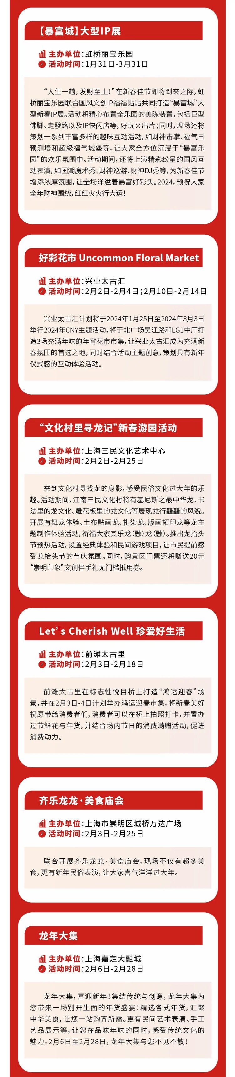 2024“跨年迎新购物季”持续进行中~龙年新春即将来临,结合“龙舞上海 春照商圈”主题,市商务委优选了四百余项特色活动,主打86项重点活动,一起来看看主要亮点↓