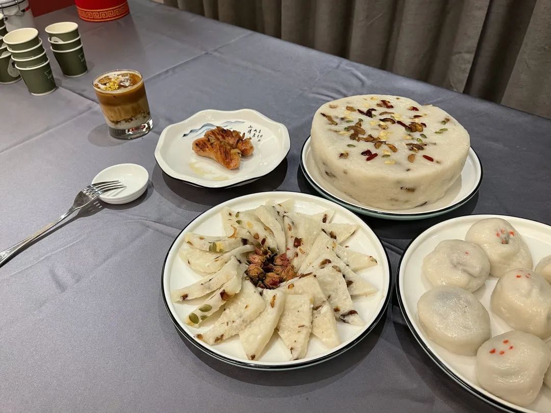 一旁后厨的工作人员正在准备晚餐,迎接即将来此入住的客人们。崇明有一句民谚:“有钱没钱,蒸糕过年”。每逢过春节的时候,崇明人的餐桌上自然也离不开崇明糕。“拾花”为住户准备了花样繁多的崇明特色菜肴,其中一道道崇明糕创意菜品令人眼前一亮,不仅美味,更有着“新的一年步步高升”的美好寓意。