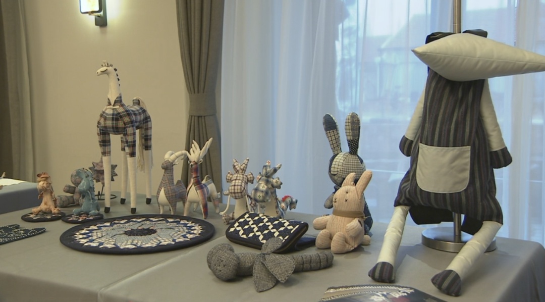 直播开始前,记者走进位于新河镇的“拾花”民宿,民宿主周勤和管家正忙着布置自家民宿,灯笼、春联、福字、贴花……室内室外满眼都是喜庆的“新年红”。民宿大厅内,摆满了崇明非遗好物的风物市集让人眼前一亮——龙主题土布贴画、喜字纹样崇明大米包装袋、土布编织包等琳琅满目的文创产品,让民宿充满了浓郁的文化特色。