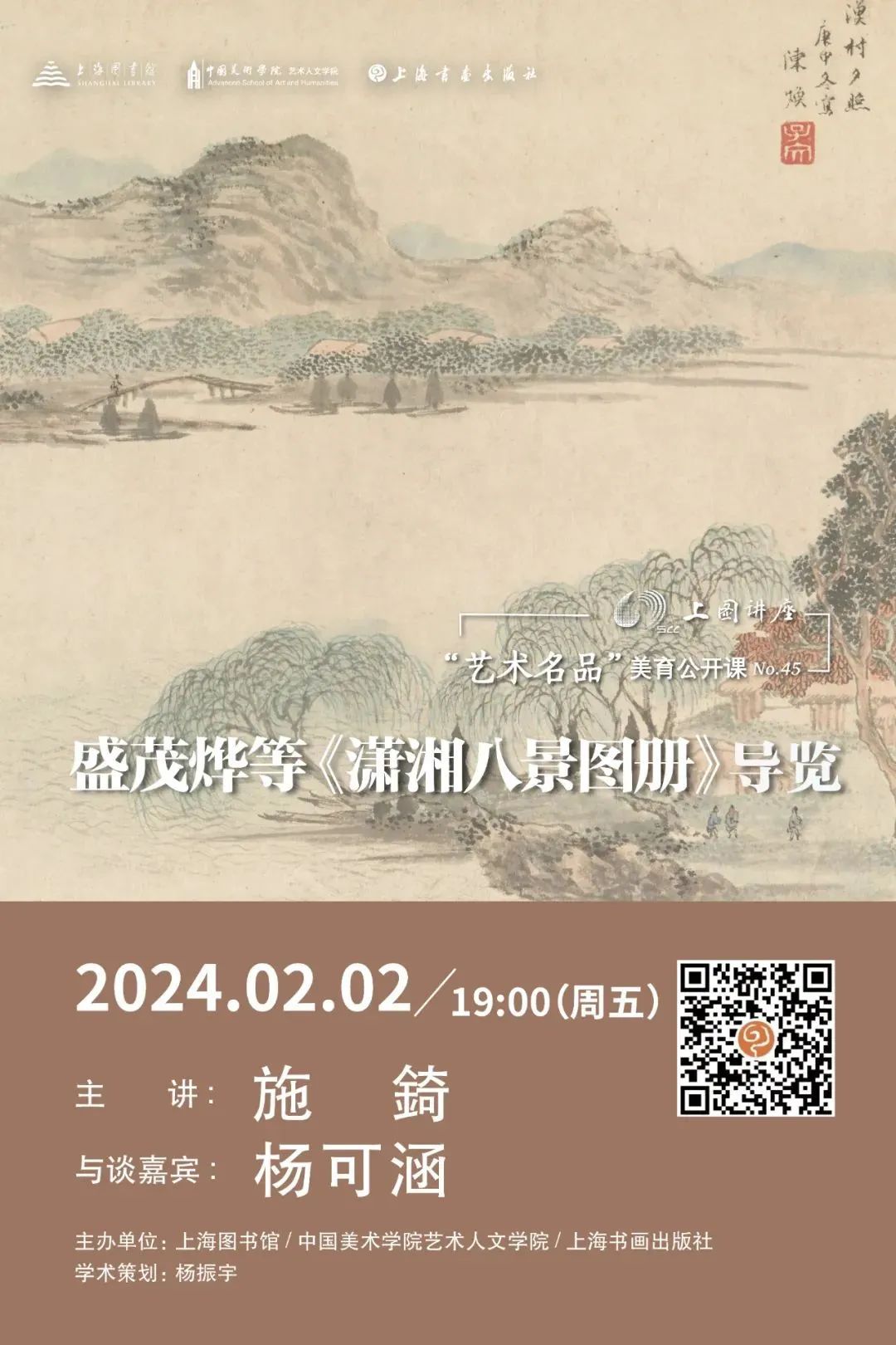 讲座首先从两宋的“潇湘八景”文化出发,继而对明代晚期盛茂烨等6位书画家合作的《潇湘八景图册》作一全面的介绍,对参与创作的书画家的生平和交游进行介绍,对书画的形式和特色进行解读。《潇湘八景》在明代脱离了南宋时代的禅学意境,作为一般的文人诗意画的母题进行创作,通过了解这套册页,可以认识到此时的“潇湘八景”成为了交游合作的上佳例证。吴中书画家创作的这一类诗意山水画主要表现隐居田园生活,清新雅致,不带过多的复古气息,也不过多地追溯前人笔法,因此没有摹古德晦涩之感,却能唤起身临其境的诗情画境。