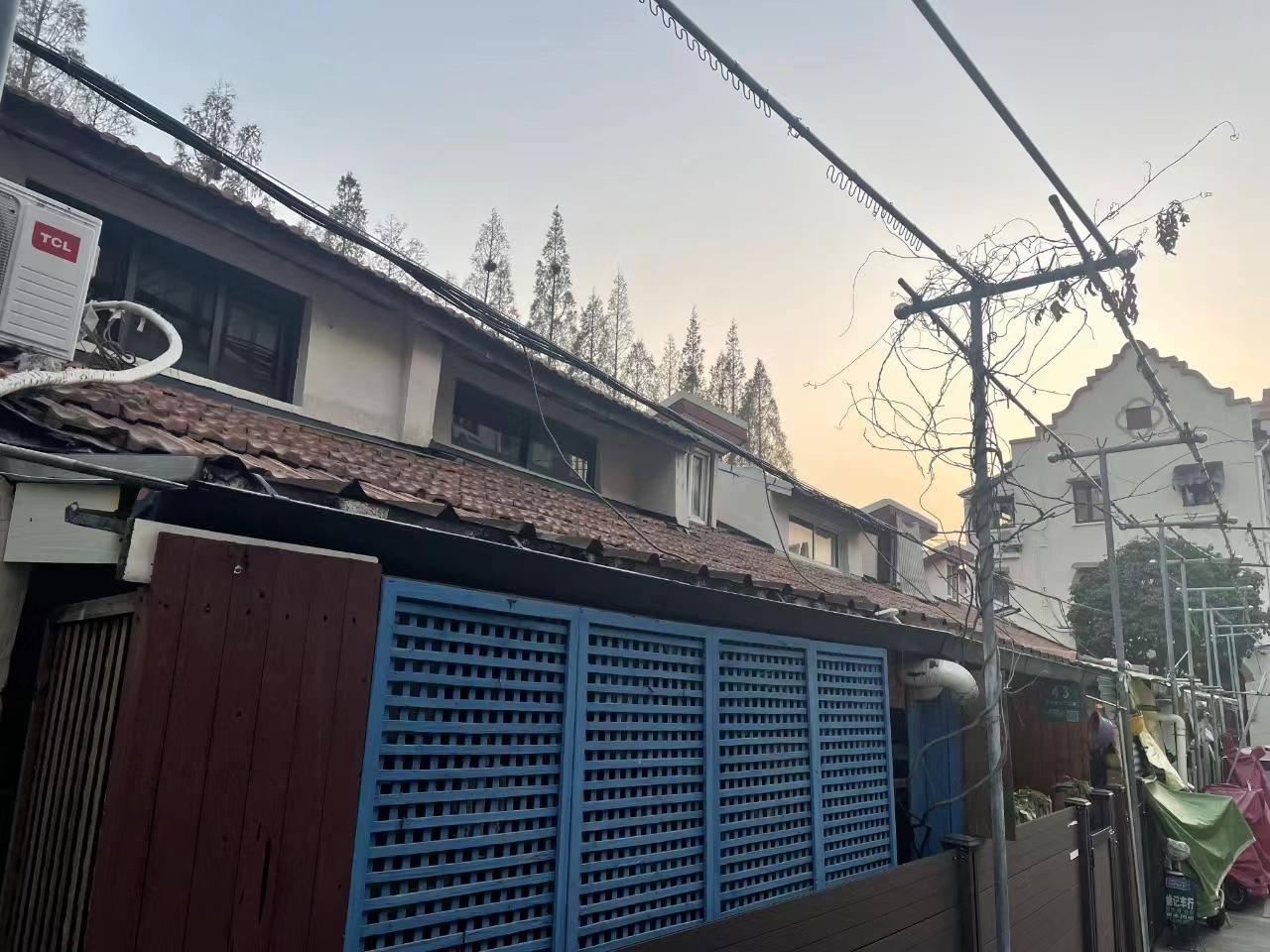 淮海中路街道淡水邨小区38号—50号是连排矮平房,原本被用作工厂的车间。上世纪60年代末被改建成单层房屋,用于居住。木制电线杆因历史遗留问题一半镶嵌于居民房屋内,一半竖立在房屋屋顶上,经历着日晒雨淋,一直使用至今。