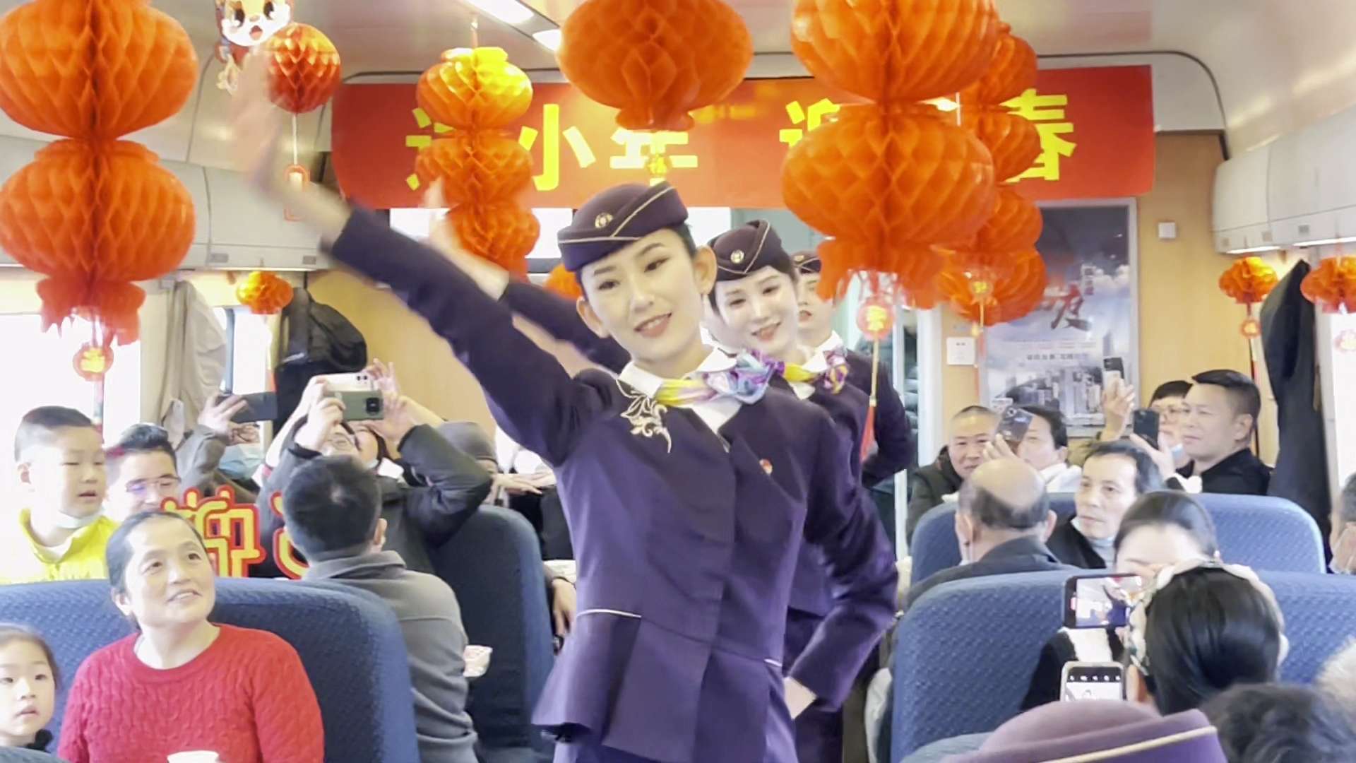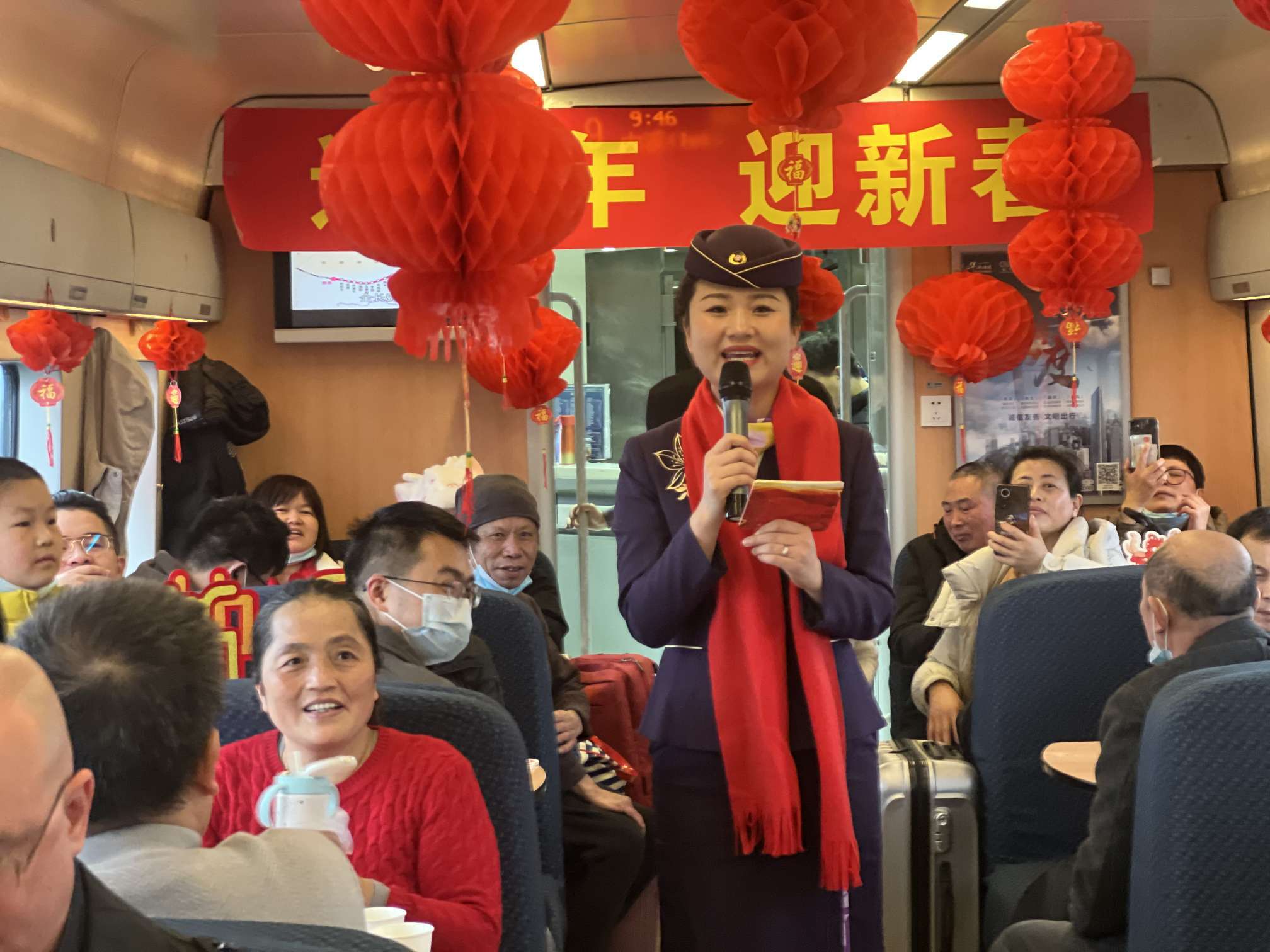 大红灯笼、喜庆窗花、列车员带来的文艺节目表演,旅客手写福字和春联……车厢内洋溢着温馨的节日氛围。伴随着欢快旋律的响起,列车乘务员为旅客精心准备了各种节目与民俗活动。