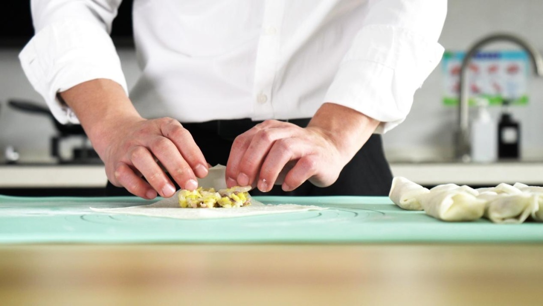 将春卷皮两头折起,卷成一个小枕头形状,并用水淀粉封口。
