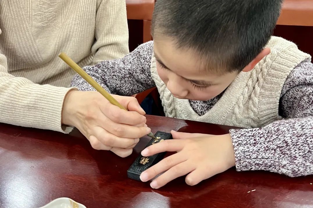 “描金是制墨的最后一道重要工序,工作者们会用毛笔,将金银等色彩在黑色墨锭上勾勒文字、图画。这一工序需要高度的专注、耐心和经验,我们体验时也要慢慢来……”活动中,孩子们在老师细致耐心的指导下,学习着描金技巧,并动手尝试墨锭描金,收获了自己亲手制作的描金作品。这些作品,成为了孩子们用心感受和体验传统文化的见证。