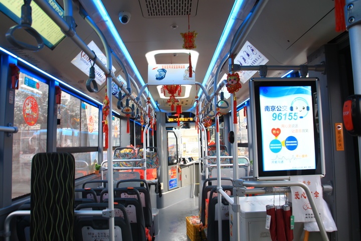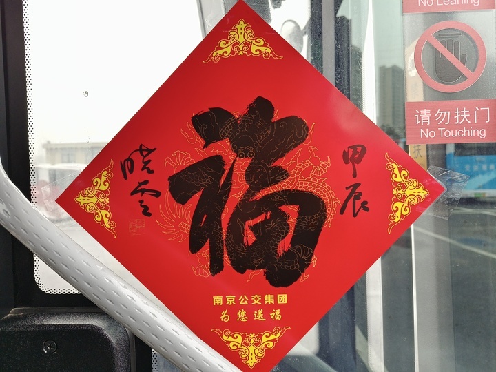 “客盈紫气龙蟠地,车载春风虎踞城”“钟山春鼓唱强富,东路龙图向建康”……不仅外观吸睛,车厢里也充满了“年味儿”。车门上张贴了中国书法家协会主席、江苏省书法家协会主席孙晓云和江苏省文化馆馆长、江苏省非物质文化遗产保护中心主任赵彦国书写的“福”字,以及南京诗词学会创作,江苏省书法家协会会员、南京市书法家协会理事、南京江北新区书法家协会副主席殷如意书写的楹联,车窗上张贴了龙年新春窗花,整个车厢充满喜悦,文化“年味”别样浓,对市民充满美好祝福。