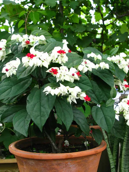 盆栽常绿小灌木。花萼中部膨大,顶端深裂,花冠深红色从花萼长出;雄蕊和花柱伸出花冠外,恰似龙吐宝珠。