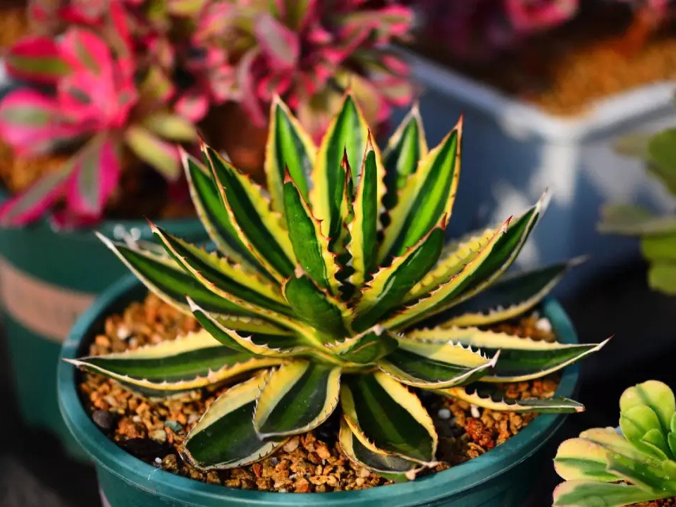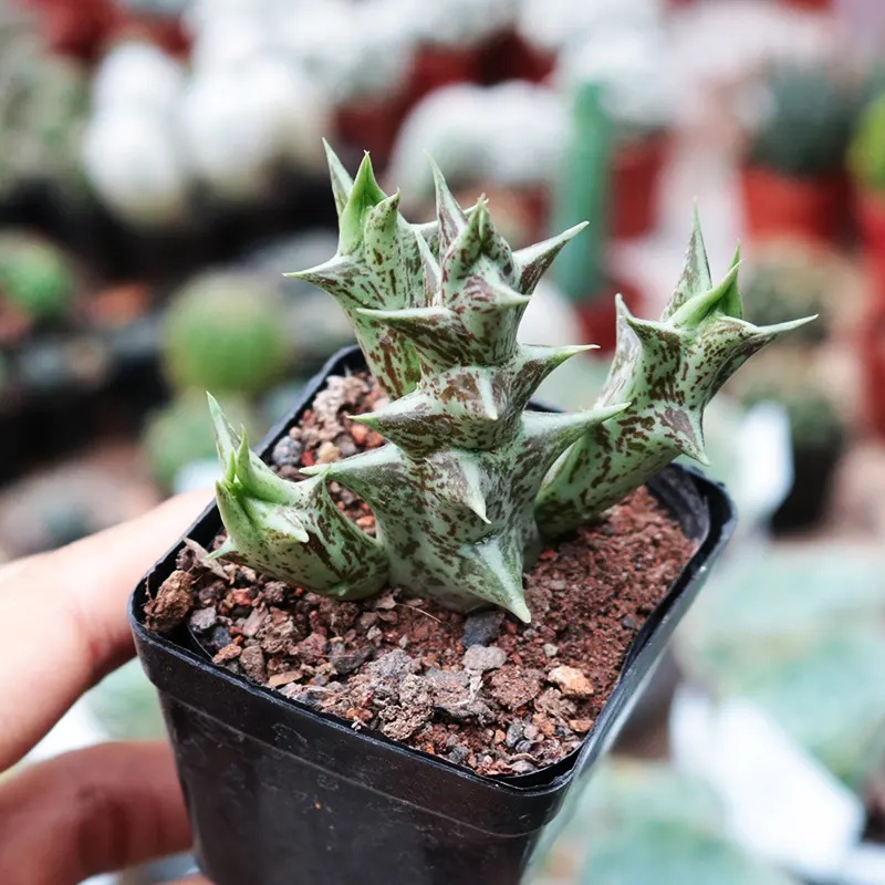 肉肉家族成员之二,叶基生、肉质莲座状,先端具暗褐色硬质尖刺,叶缘疏生刺状小齿。园艺品种可无刺,株形大小差异巨大。