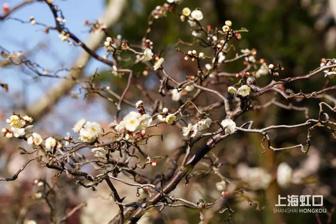 当季正是梅花盛开之时,在梅的品种中,有一种龙游梅,它的枝条不需要人为加工,就呈现出自然虬曲。雪白色的梅花点缀枝梢,更显游龙身姿不凡。