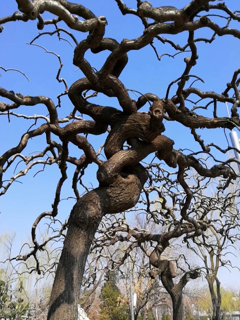 龙爪槐因树枝扭转弯曲下垂,形似蛟龙的利爪而得名。是国槐的芽变品种,它的树冠层层下叠犹如华盖,也是中国古典园林中的常用植物。