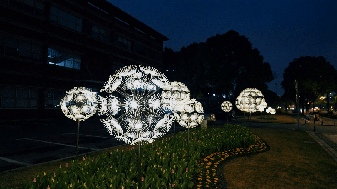 万盏花灯齐绽放,灯影树花暖新春。在金都路,一片“蒲公英”在草坪上闪耀着光芒。灯具模仿了蒲公英的造型,为金都路增添了一份浪漫和唯美,仿佛给人们带来了一个梦幻的世界。