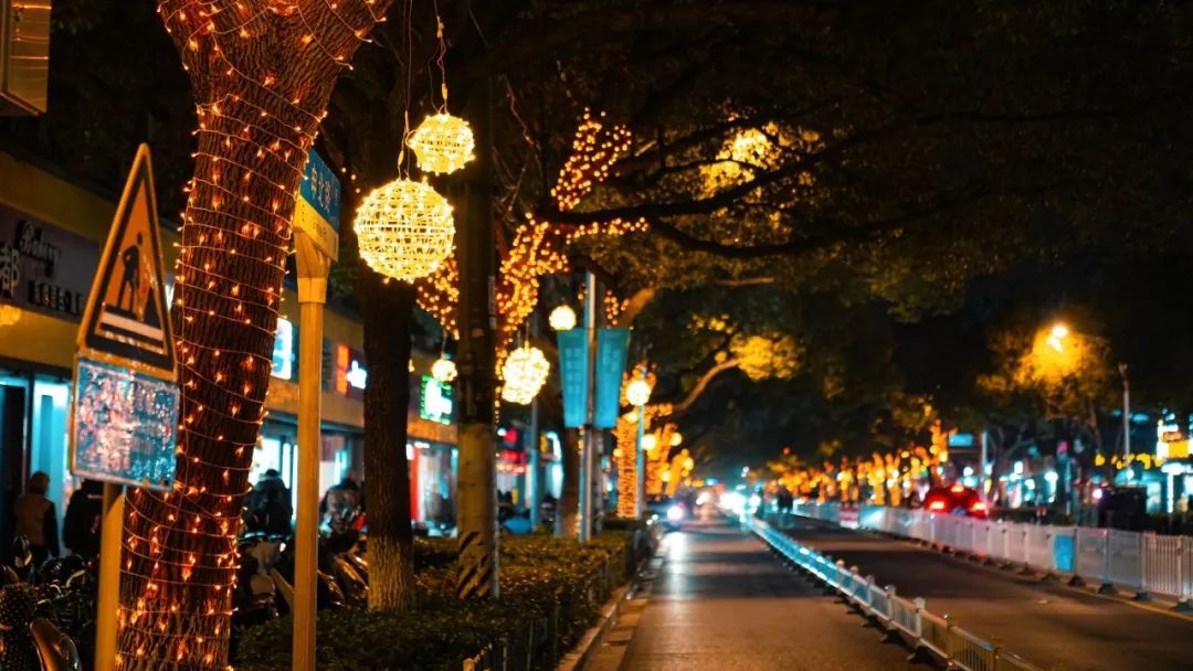 钟声未响,年味已浓。漫步在夜幕下,流光溢彩,繁华似歌。挂在树上的灯饰、灯笼,让申北路整条街都亮了起来。缤纷的霓虹引人驻足,既装点了夜空,也温暖了一颗颗奔波忙碌的心。