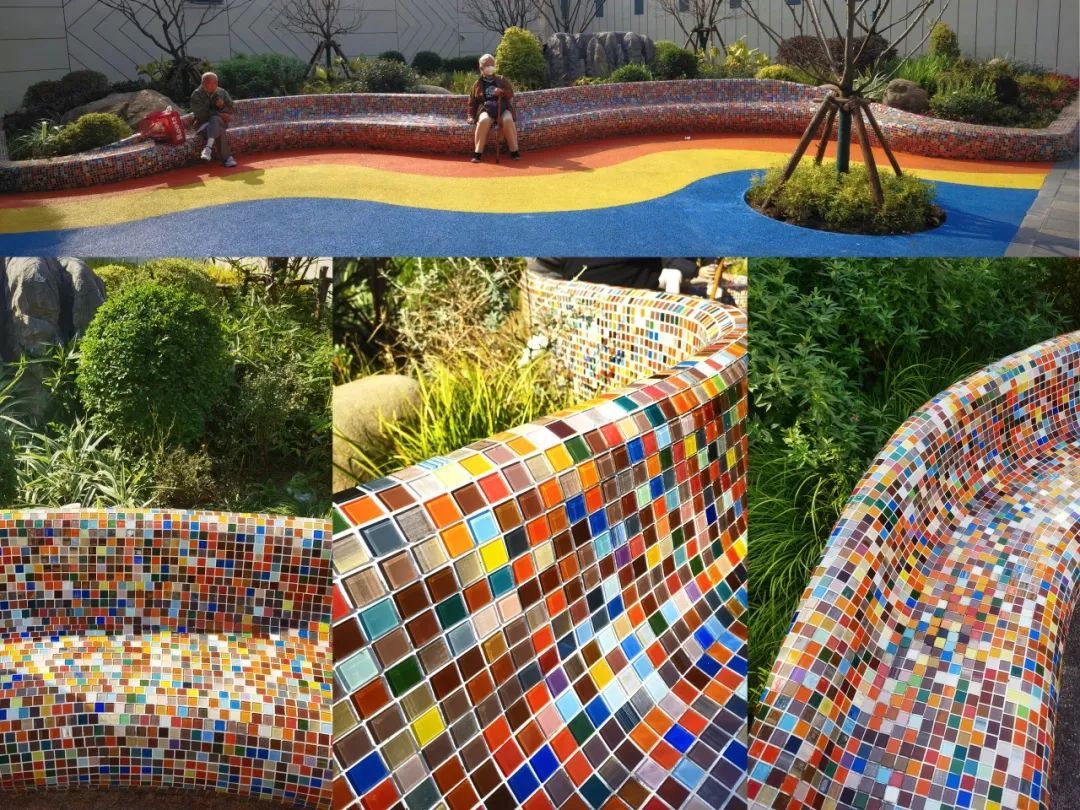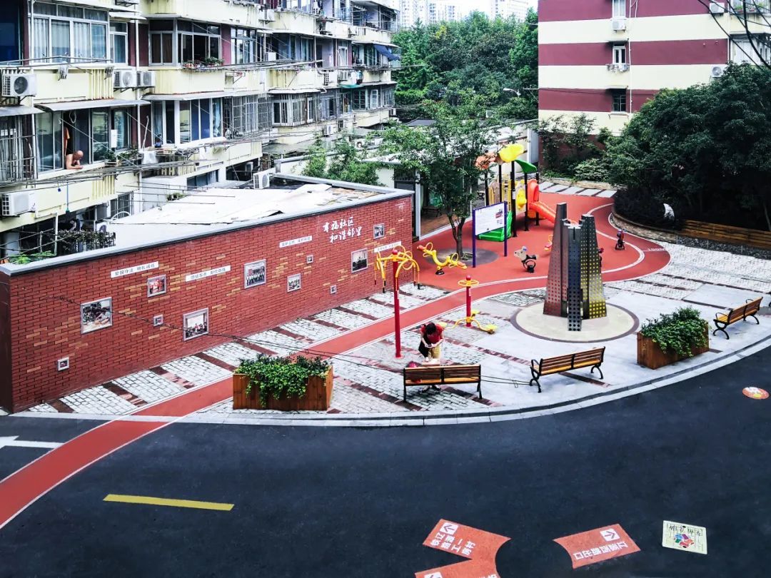 项目充分征求居民意见,采用弧形座椅和塑胶铺地,为孩子的玩耍、老人的休憩提供安全的场所。活泼的彩虹色焕发场地的活力,通过微小精致的景观改造,大大提升居民的幸福感。