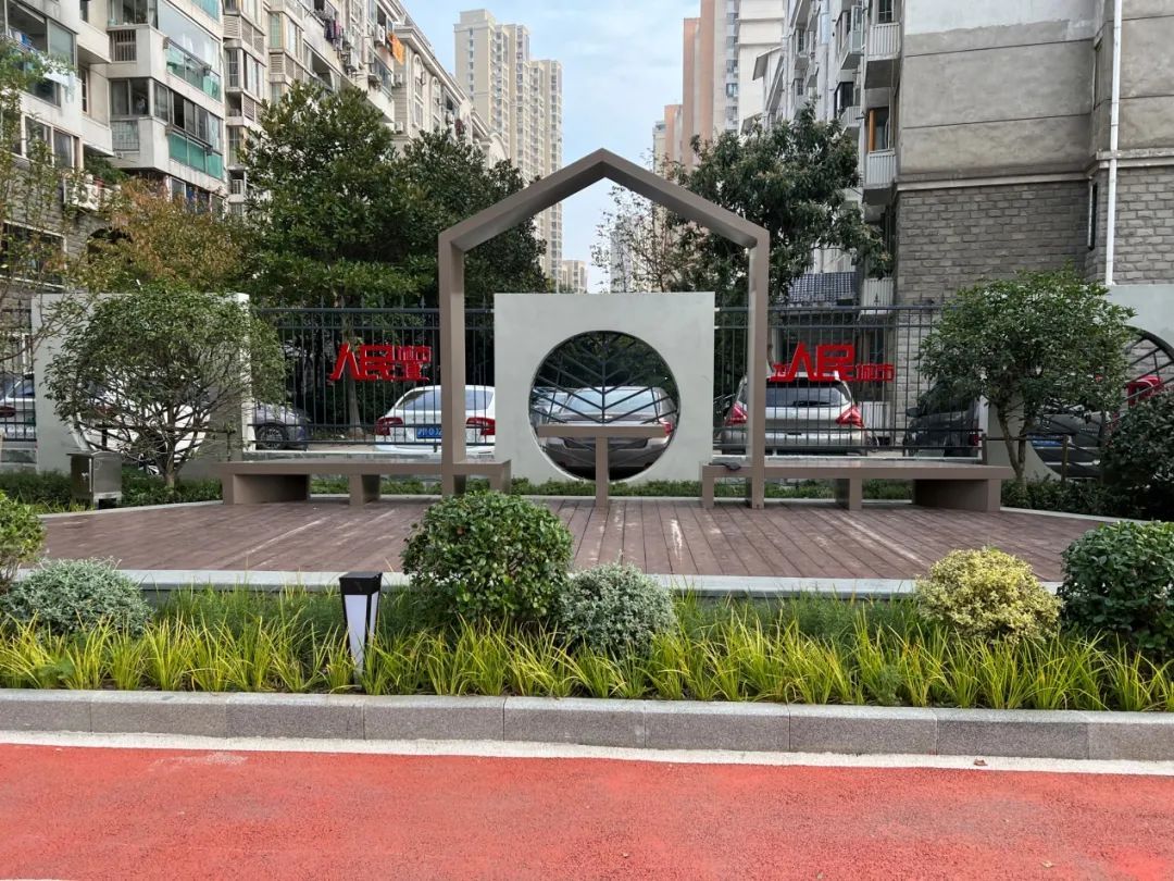 项目通过新建围墙与现有小区围墙链接;新建漫步道串联;结合木平台和休憩廊架供居民休憩交流;花坛内点缀小品;漫步道周边设置灯具,打造夜景灯光;结合共色资源,引入“人民城市”概念。江浦路龙江路口袋花园建设项目得到了居民、周边企业好评,形成了良好的示范效应。