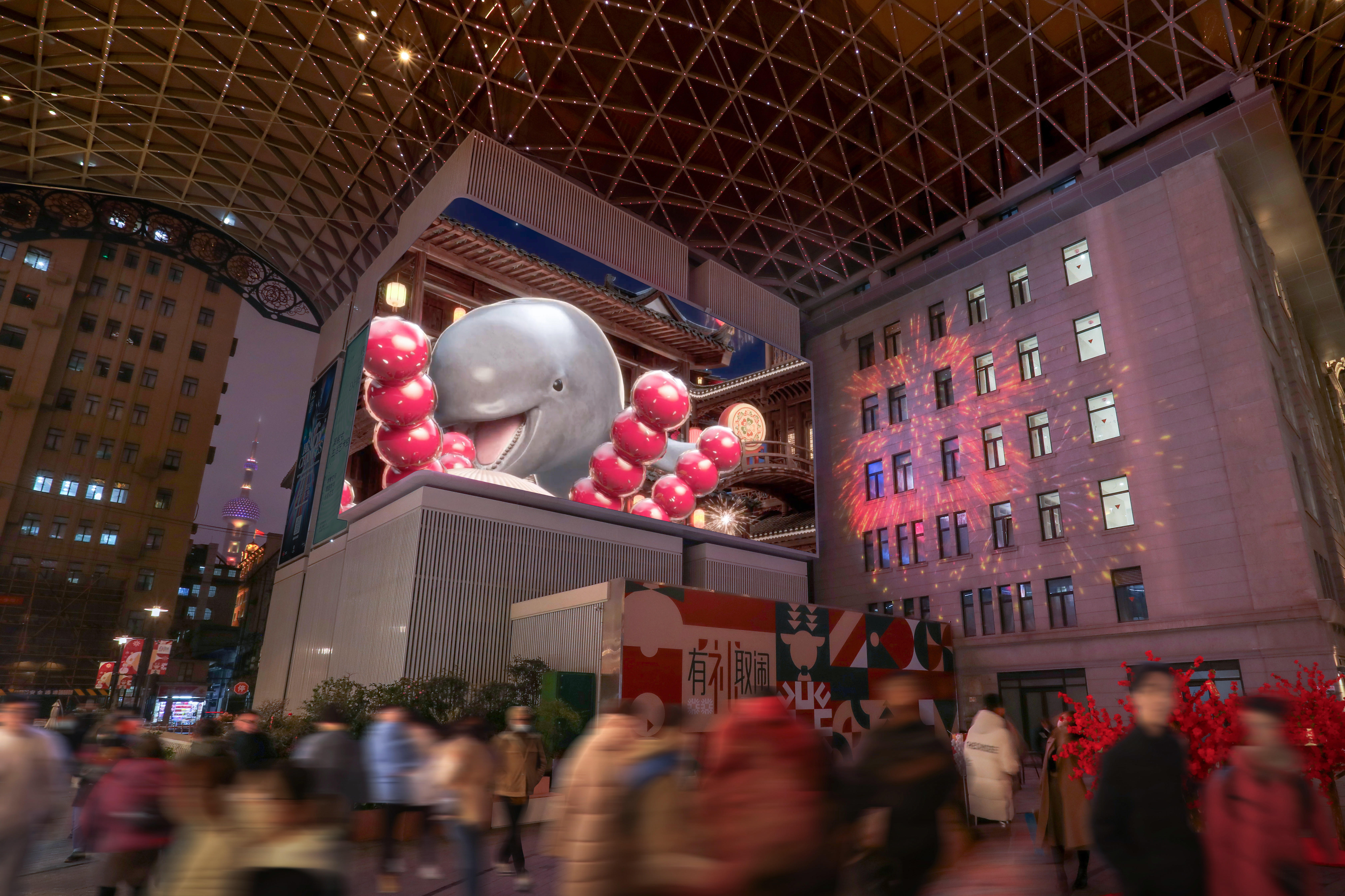 夜幕时分,在一侧的巨型3D屏幕上,“微笑天使”江豚跃动而出,为龙年新春送上美好的祝福。“还是蛮新颖的,特别在夜里,很有氛围。”一些市民表示。