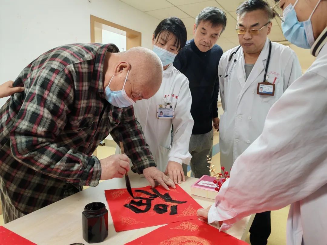 “祝你们新年快乐,身体健康,明年我也继续给大家送祝福。”精神抖擞、中气十足,眼前这位老人就是96岁的李爷爷。临近春节,在护理人员的帮助下,他拿出了笔、墨、纸,挥毫泼墨,写了一张又一张的“福”字。尽管已是鲐背之年,李爷爷依旧精神抖擞地在医护人员搀扶下,站在桌旁专注地书写。当记者问起想把福字送给谁,爷爷毫不犹豫地说:“我最想送给一直照顾我们的医生和护士。”