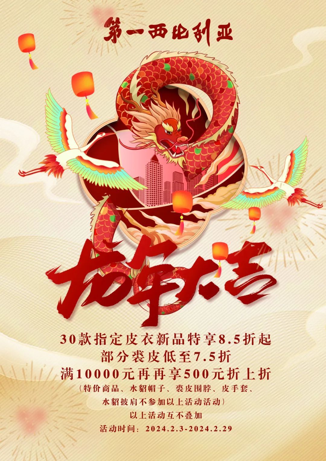 新春佳节,给自己或家人的衣橱添一件心仪的皮草,也是一份心意满满的表达。2月3日至2月29日,走进第一西比利亚,即可享受30款指定皮衣新品8.5折起;部分裘皮低至7.5折,满10000元再减500元的优惠折扣。