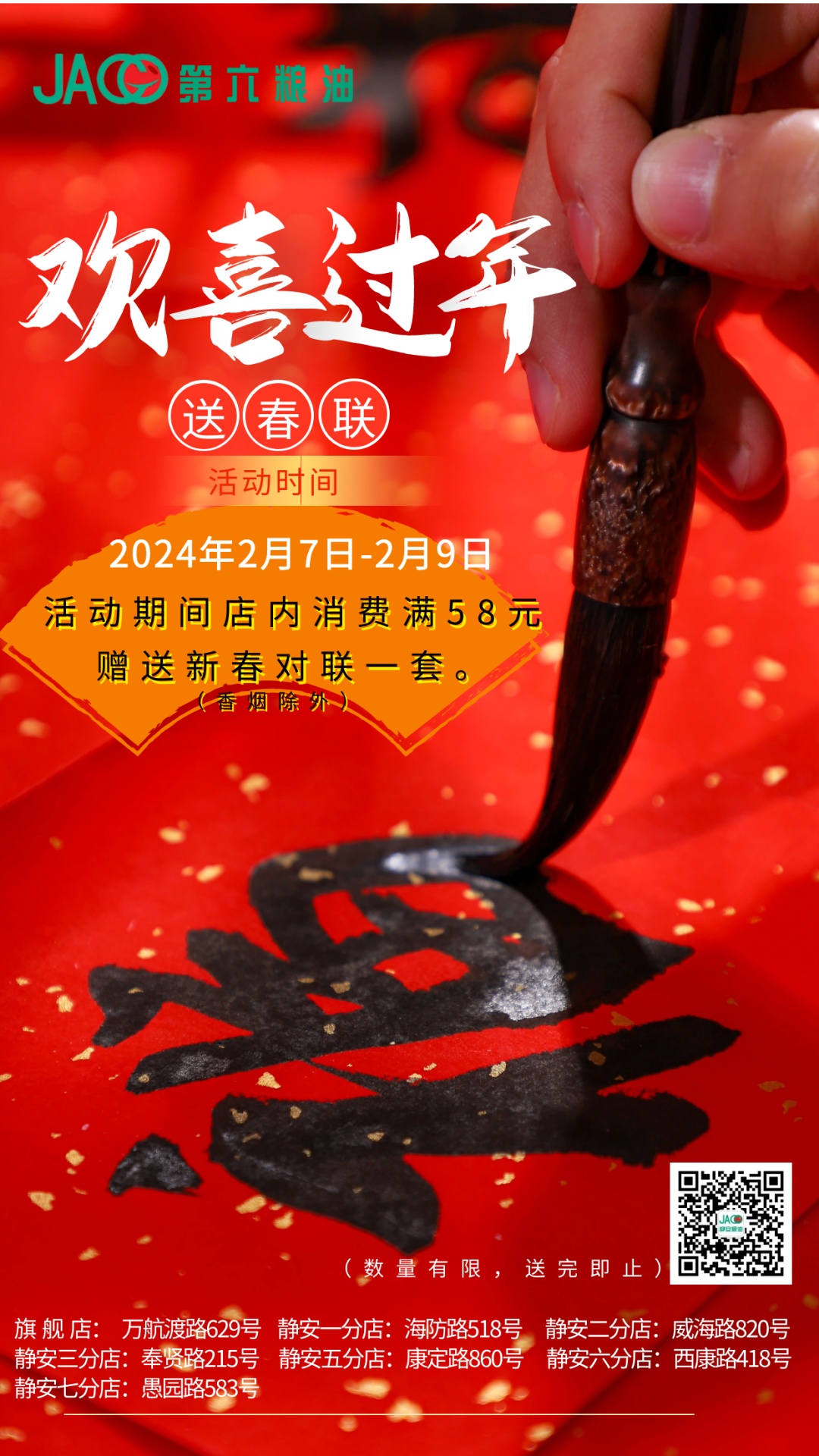 新年欢聚时刻,需要美食、美酒、佳肴来分享愉悦心情。第六粮油全市各门店在2月7日至2月9日,推出“欢喜过年送春联”活动,期间凡在店内消费满58元,赠送新春对联一幅(香烟除外)。