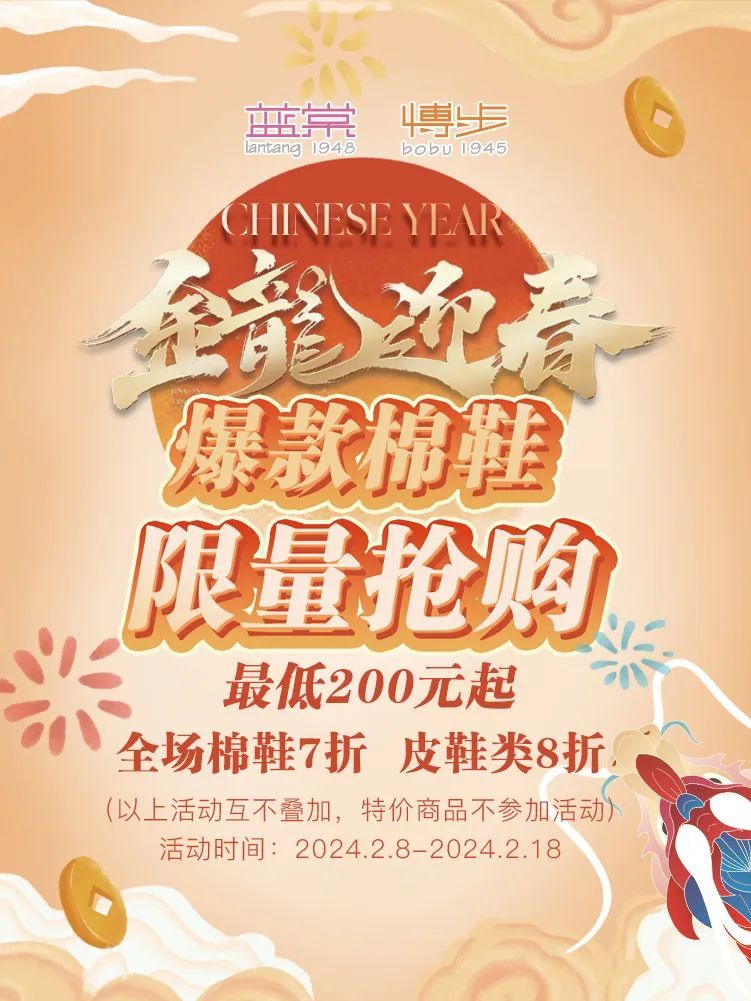 龙年行大运,当然少不了一双时髦百搭的新鞋,走出龙年新格局。2月8日至2月18日,蓝棠、博步推出爆款商品限时折扣和限量抢购活动。其中,全场棉鞋限时7折,皮鞋类限时8折;爆款商品200元起,先到先得(以上活动互不叠加,特价商品不参加活动)。