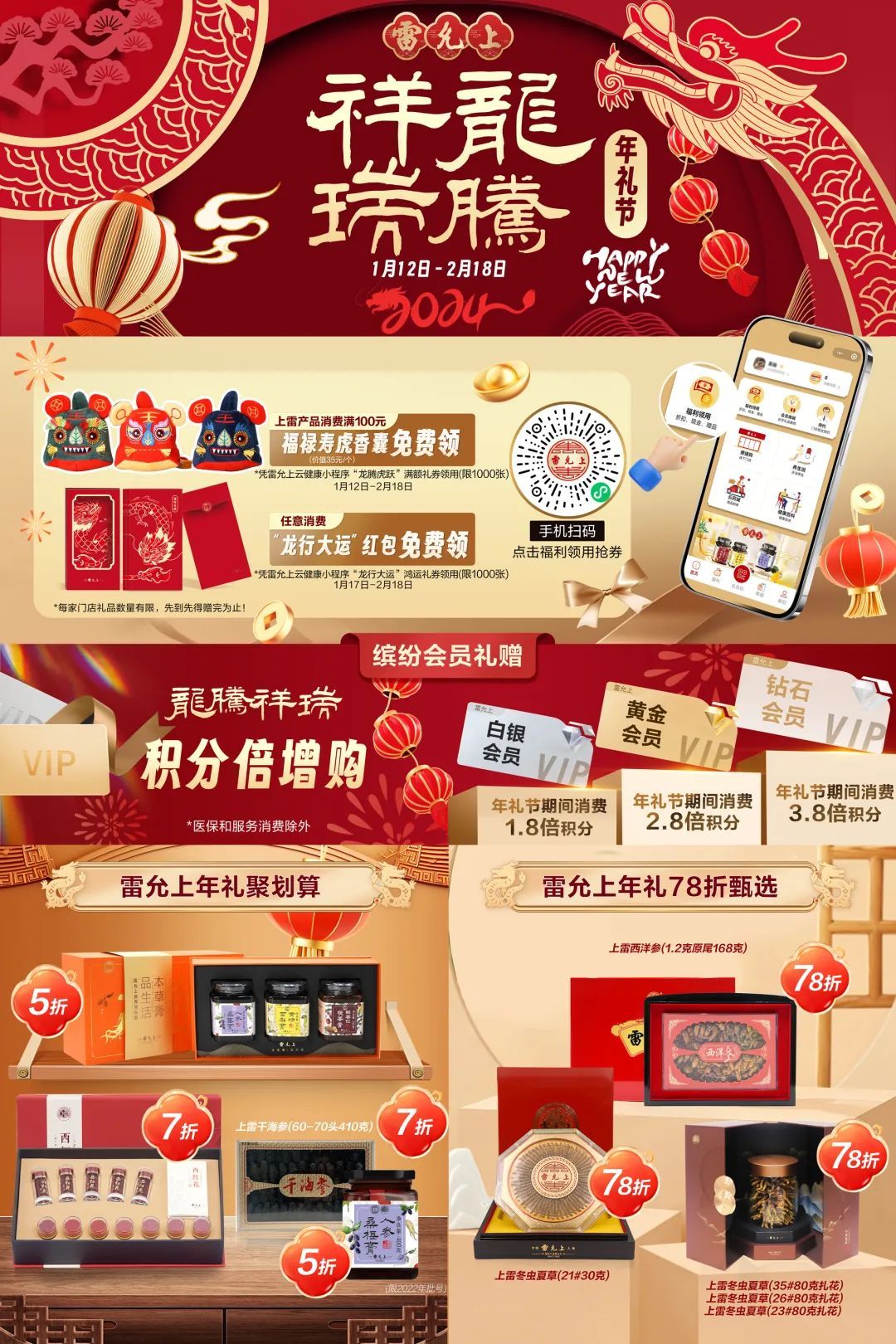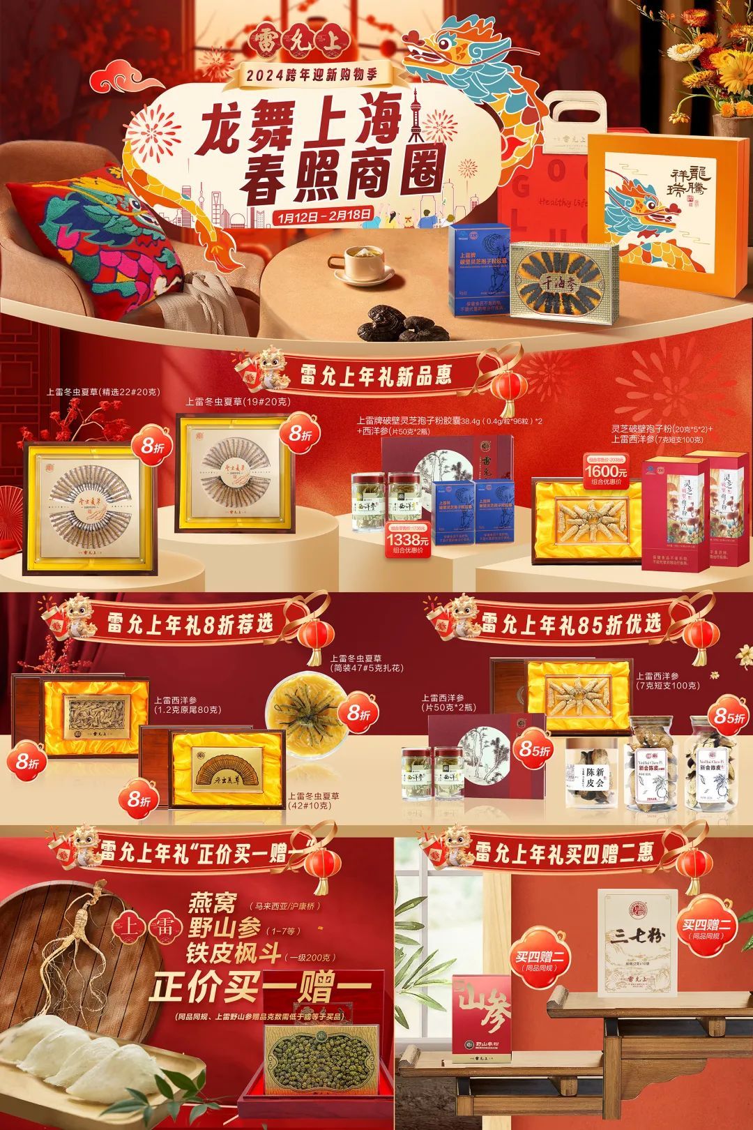 年礼节期间,各类年礼产品均有不同程度让利,野山参等一部分拳头产品更以“买一赠一”的高力度优惠回馈市场。
