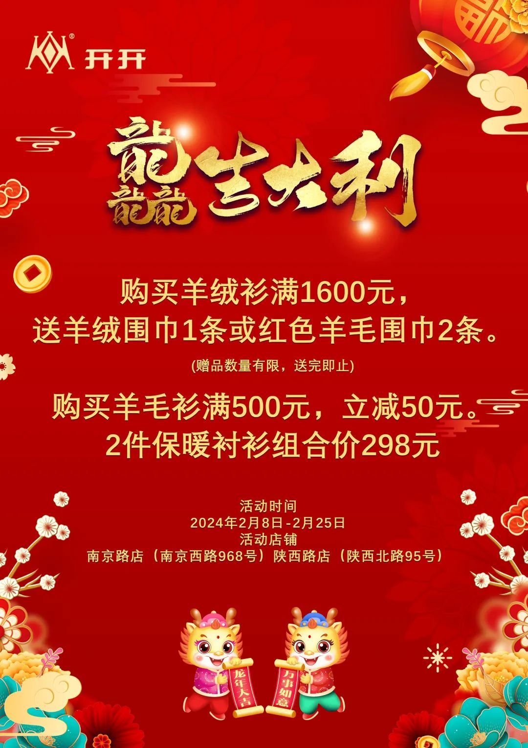 “开开”是爸爸最喜欢的衬衫、毛衣“老牌子”。春节回家,怎么能够不给爸爸带几件保暖又有腔调的新衣服回家?2月8日至2月25日,开开推出“2024约惠新春 龘吉大利”。期间,购买羊绒衫满1600元,即送羊绒围巾1条或红色羊毛围巾2条(赠品数量有限,送完即止);购买羊毛衫满500元,立减50元;2件保暖衬衫组合价298元。