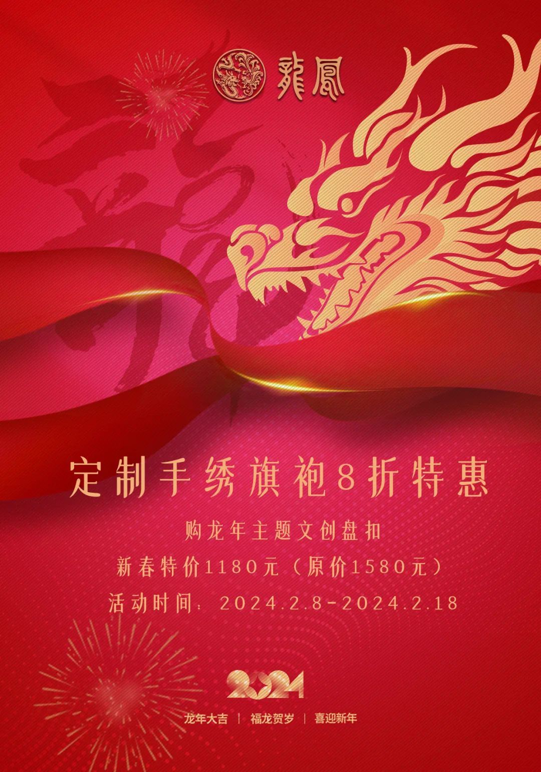 一袭旗袍让人惊艳,更道出海派女性的精致和优雅。龙凤在2月8日至2月18日,推出“锦绣迎春,华美绽放!”定制优惠。期间,定制手绣旗袍可享8折;购龙年主题文创盘扣,可享新春特价1180元(原价1580元)。