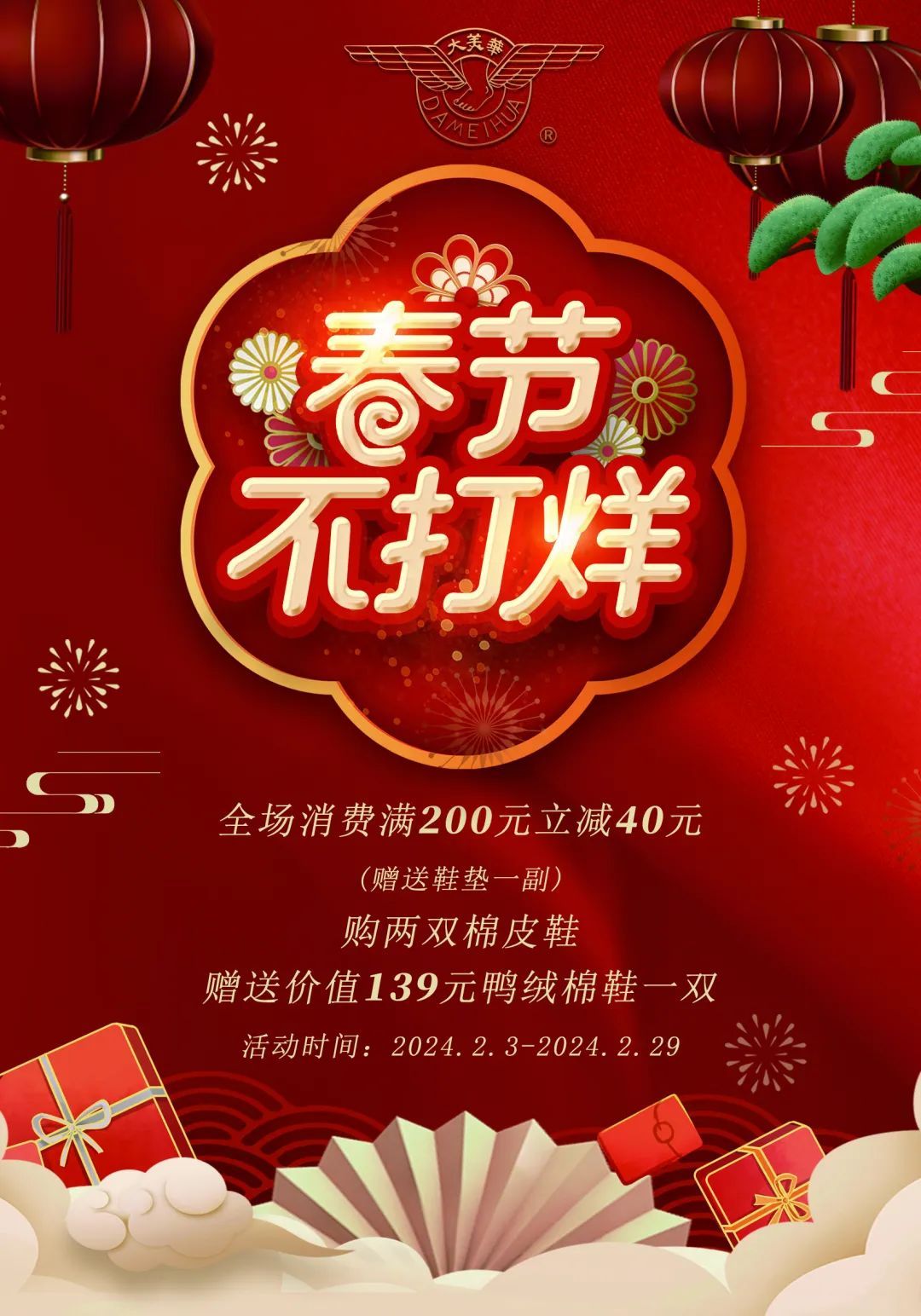 大美华在2月3日至2月29日,推出新春特惠:全场消费满200元立减40元,赠送鞋垫一副;购两双棉皮鞋,赠送价值139元鸭绒棉鞋一双(以上活动互不叠加,特价商品不参加活动)。
