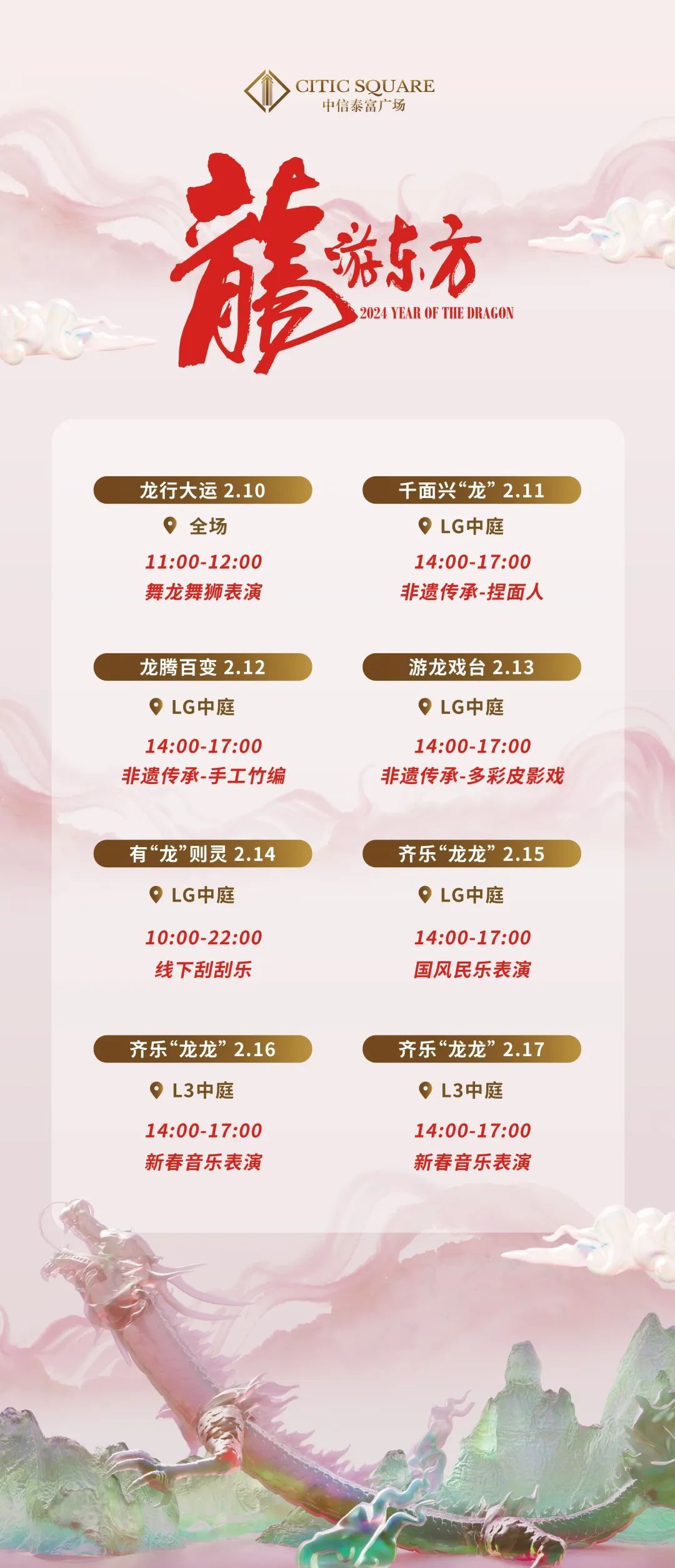 中信泰富广场于新春之际带来丰富的国风活动以及“龍游东方购物潮”系列促销满赠活动,打造独特的都市新空间。穿行于古典场景之中,可深度体验皮影舞台、舞龙舞狮、手作面人、手工草编以及国风仙乐等传统民俗的奇妙魅力。传统技艺与文化织就的国风韵味,将为消费者营造出富有传统韵味的新春氛围。