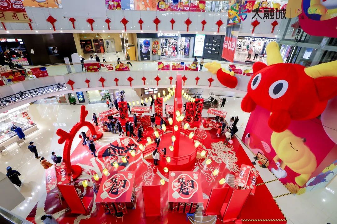 除了上新的龙年春节装饰,静安大融城于商场B1层中庭呈现兼具浓厚中国年味儿和时代潮流元素的新春游园会。占地200平方米的游园会,将六米高的龙门装置与现场书法、糖画、花灯等近十个摊位进行巧妙结合,更融入丰富的年俗互动游戏,以中国传统色为主色调,为商场披上了节日的“盛装”。