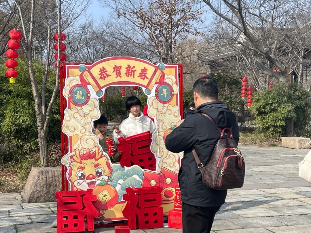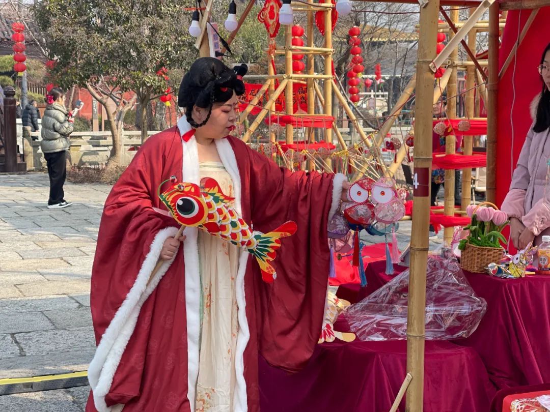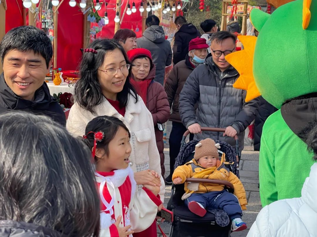 除了逛逛热闹的年货集市,现场还有不少市民游客换上古装,体验复古游戏,踊跃上前挑战投壶、射箭等中华传统体育游戏。现场,小朋友们的目光还被装扮成小龙人和财神的卡通人偶吸引,拉着爸爸妈妈参与互动,感受最真实的轻松与欢乐。