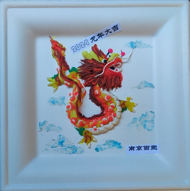 南京面塑作品《2024龙年大吉》由南京面塑代表性传承人钱翠芳创作。“在制作过程中,龙须是用双色面各搓成130根线条叠加排列,龙鳞是用三层三个大小不一样的圆点制作。没有用任何工具,全靠徒手完成。”钱翠芳说。