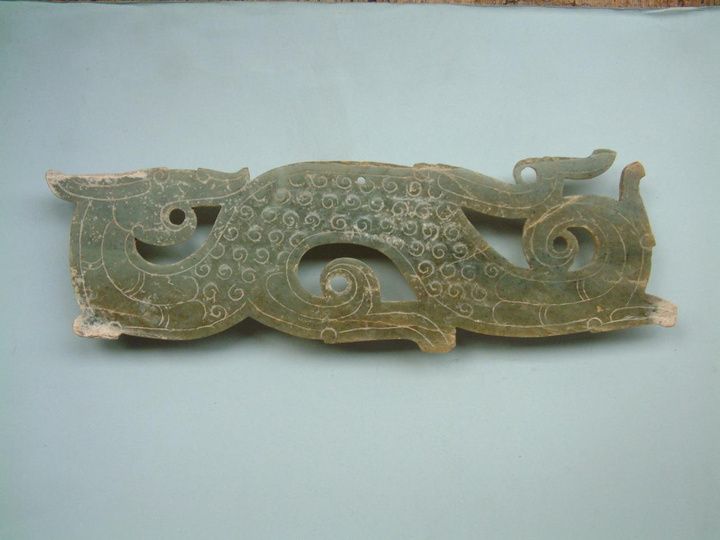 此件西汉透雕行龙玉佩,由徐州天齐山刘犯墓出土。色质青白,立体透雕。龙回首瞠目,前肢上扬,尾部上翘呈S形,四肢变作卷羽,作行走的形状,似乎是一灵动的游龙。